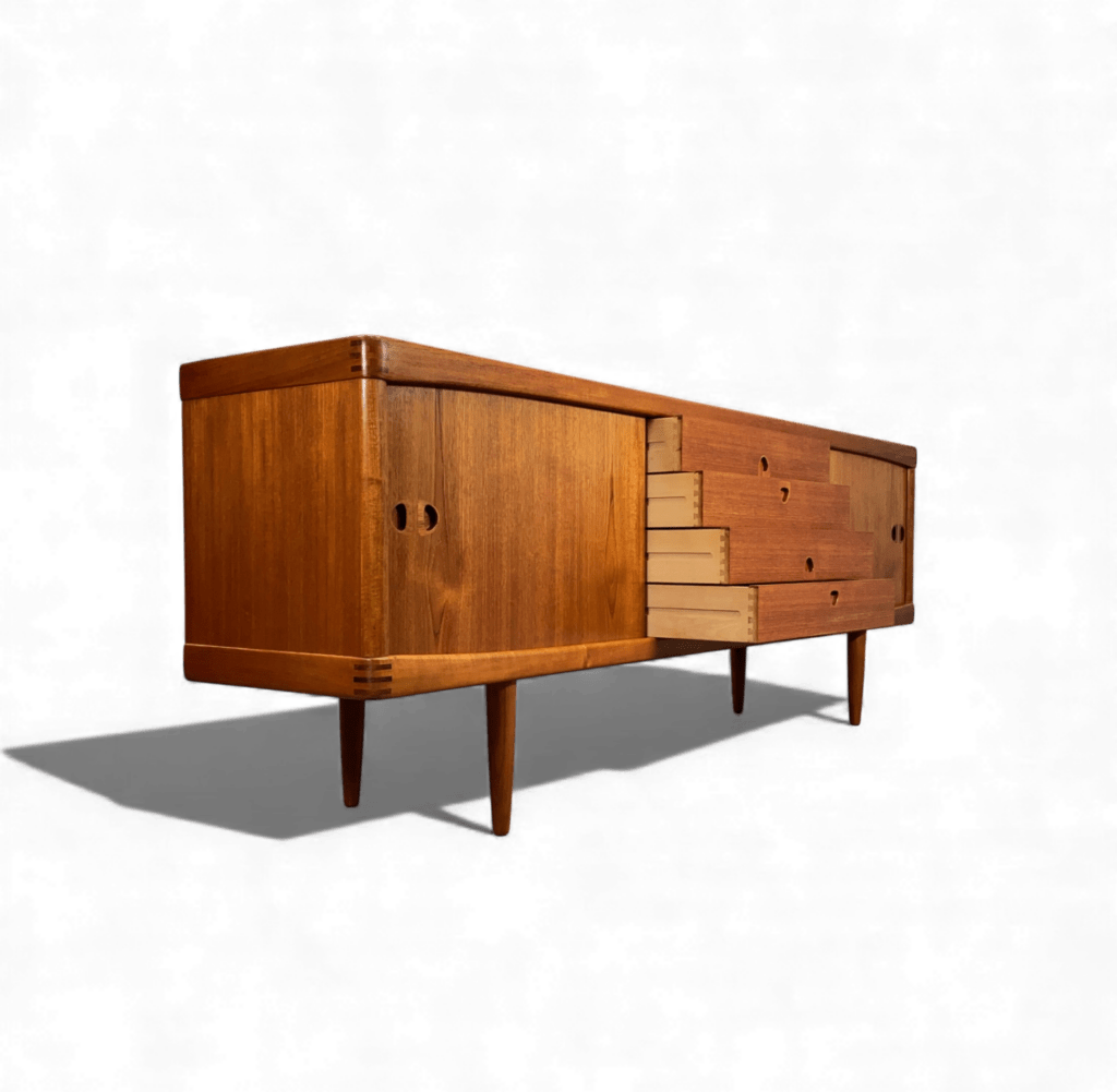 Sidebordet, som är tillverkat i teak under det innovativa 1960-talet, representerar en tidlös möbel som verkligen håller över tid och aldrig går ur modet. Med sin fantastiska finish och imponerande hantverk är det en möbel som bidrar med både funktion och estetik i alla typer av hem, och det finns absolut inget att tröttna på! Det är en investering i stil och kvalitet som kommer att uppskattas i många generationer framöver.