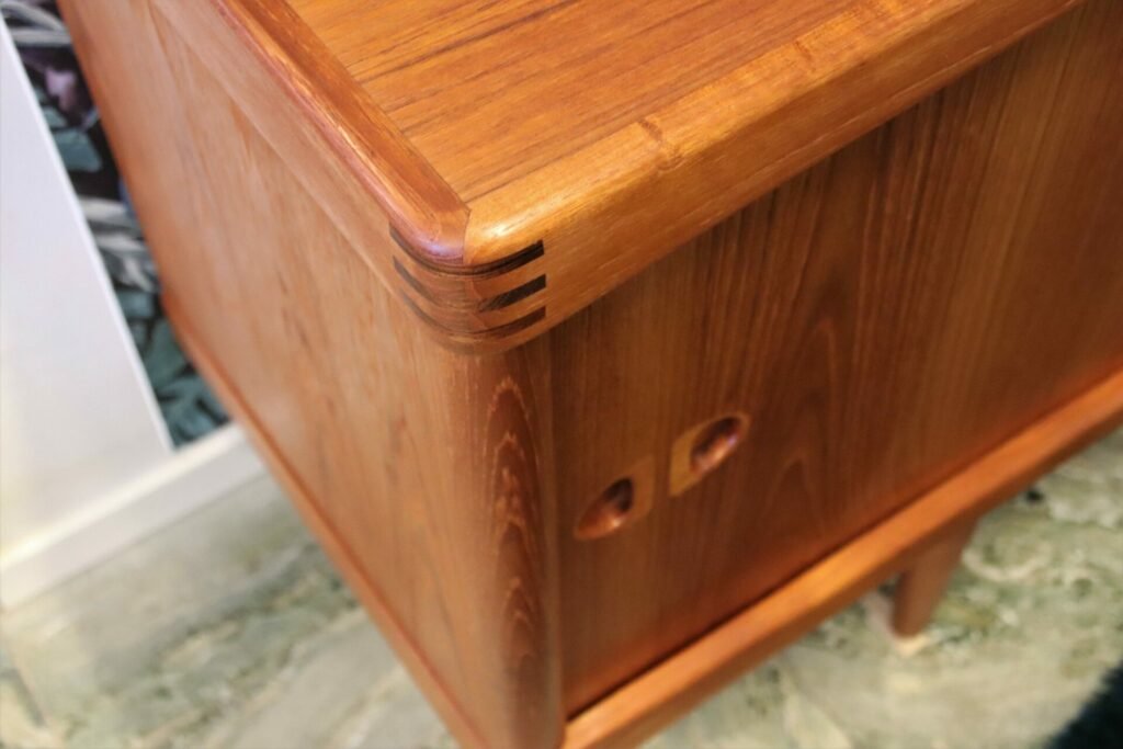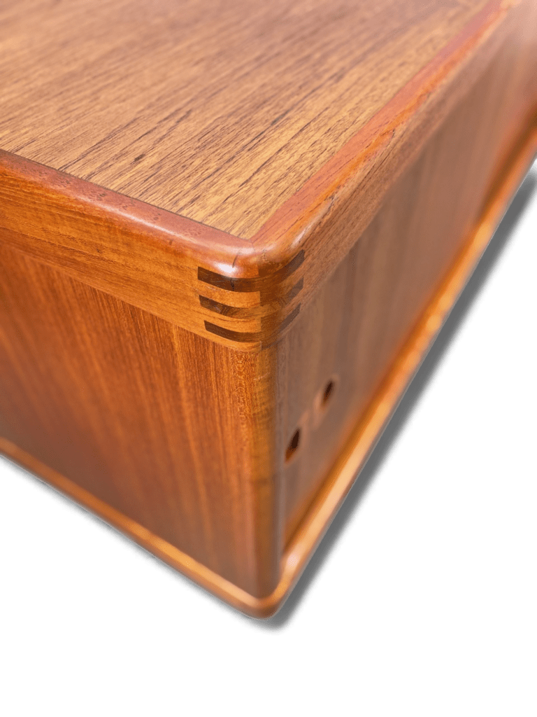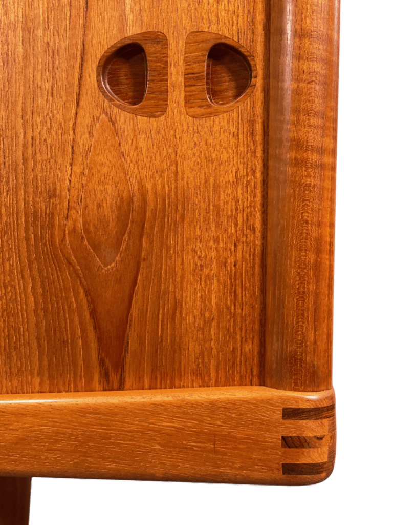 Alla kanter och hörn är rundade samt elegant inramade mot fram- och sidstyckena, och det ger en mjuk och inbjudande känsla till designen. Dessutom har hörnen synliga sammanfogningar som inte bara fungerar praktiskt utan också blir en smakfull och estetiskt tilltalande dekoration. Samma vackra sammanfogningar återfinns även på olika möbler som matbord, stolar och skåp som designern Klein har formgivit. Ett signum, som binder samman hans verk, och är ett av de mest igenkänningstecken som gör att hans stil står ut i mängden och bidrar till en tidlös elegans i varje rum.