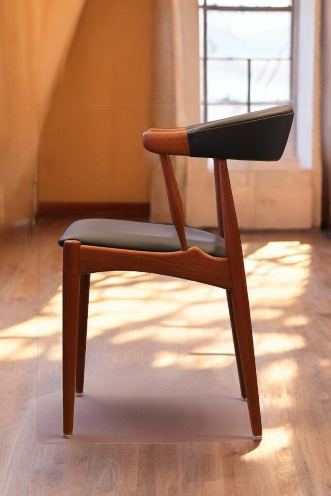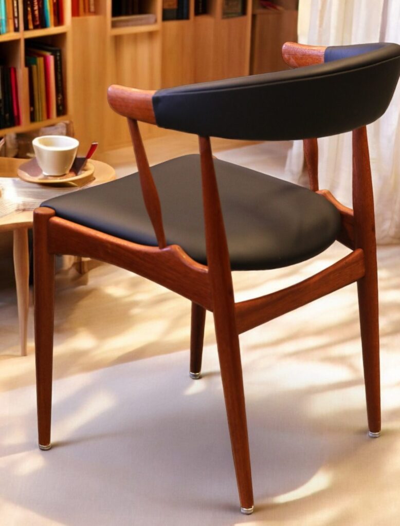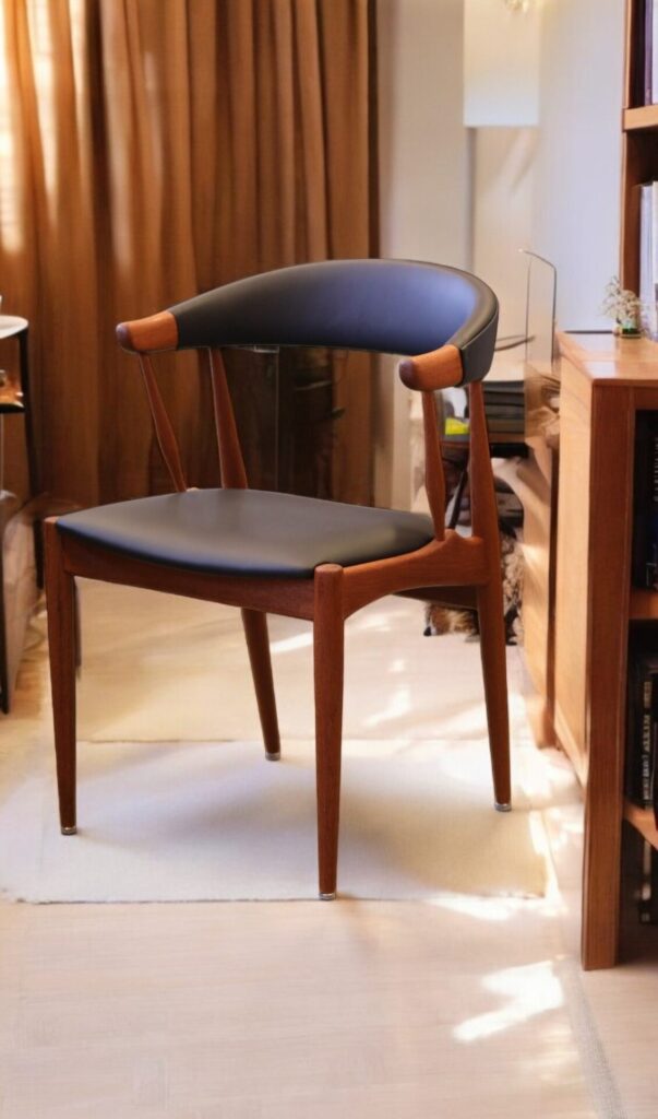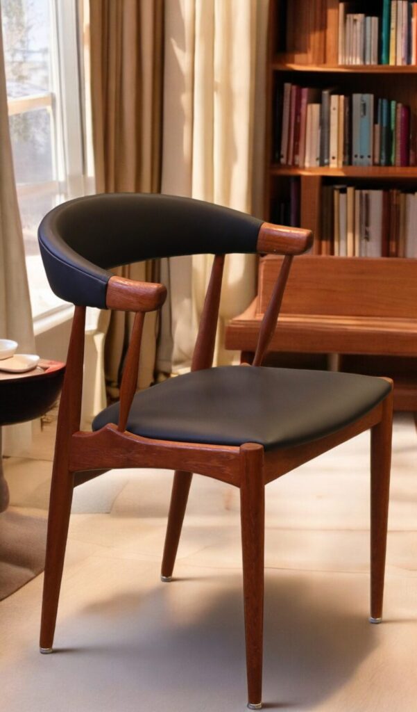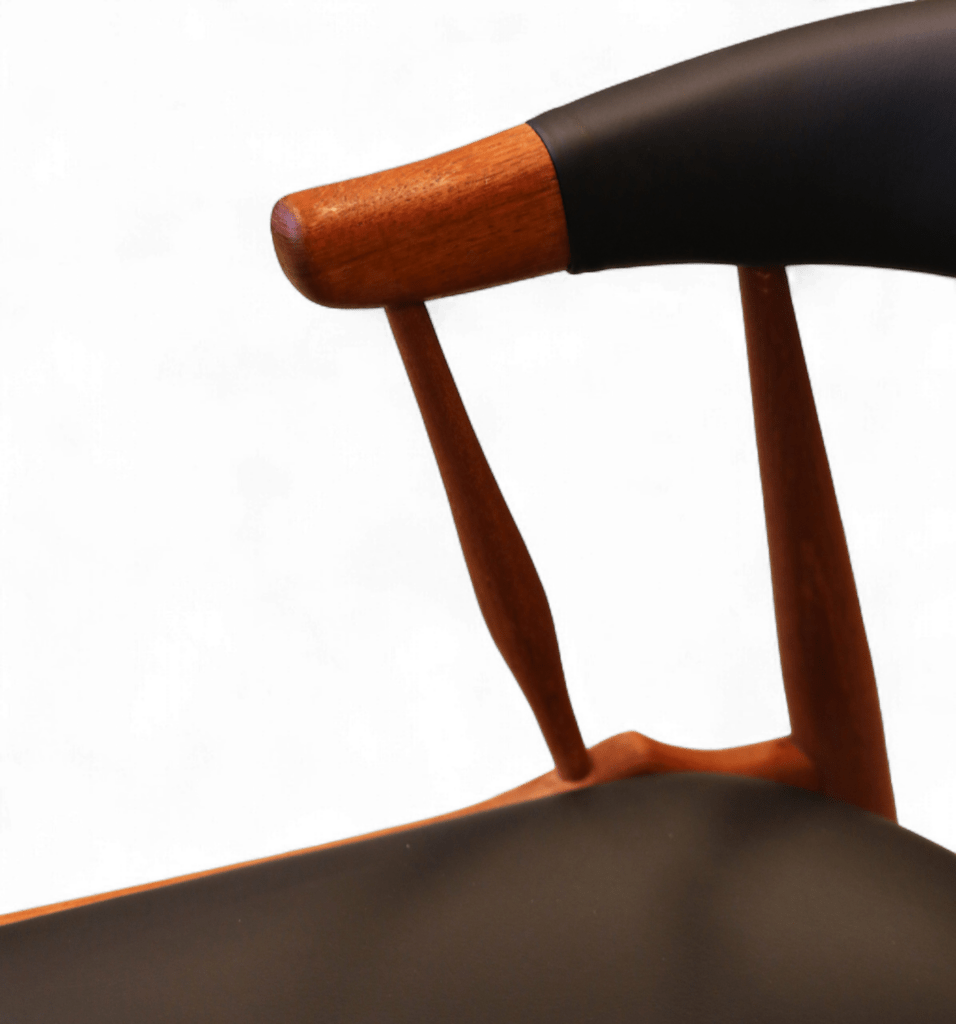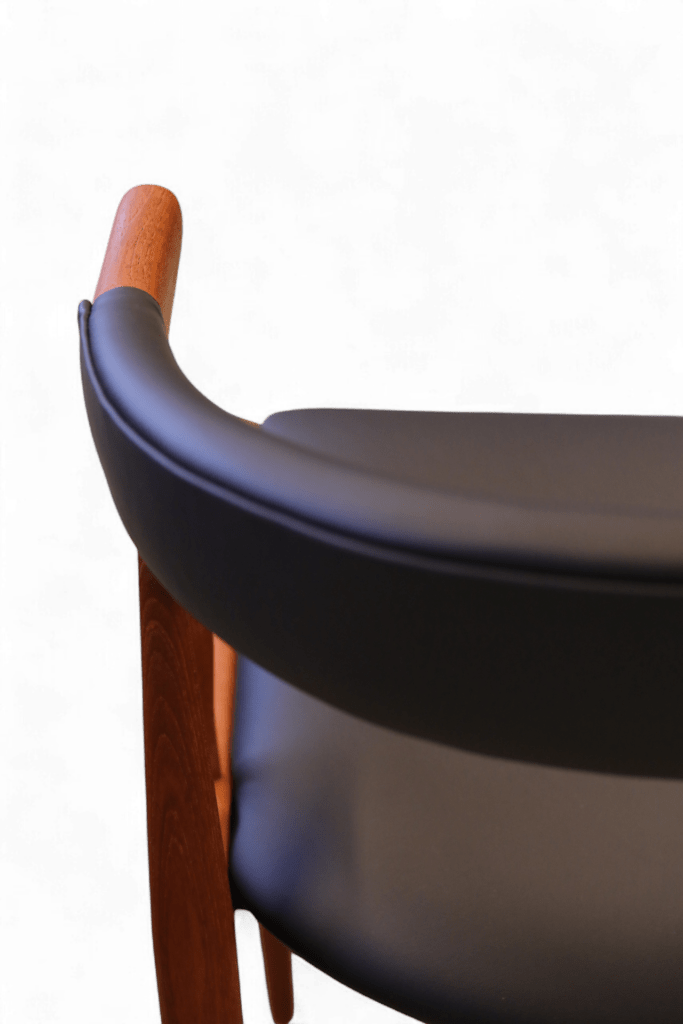 Vår karmstol är klädd i svart mjukt skinn både i ryggen och sitsen och garanterar att stolen bara kommer bli finare ju mer den används.