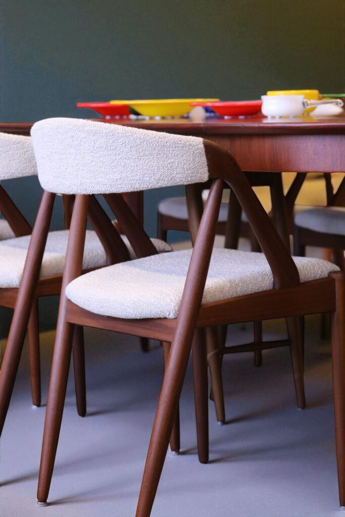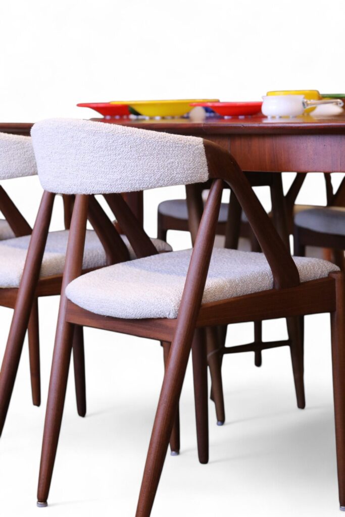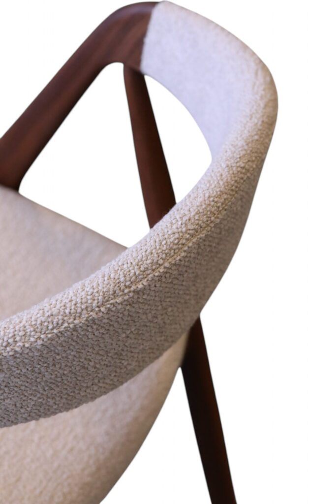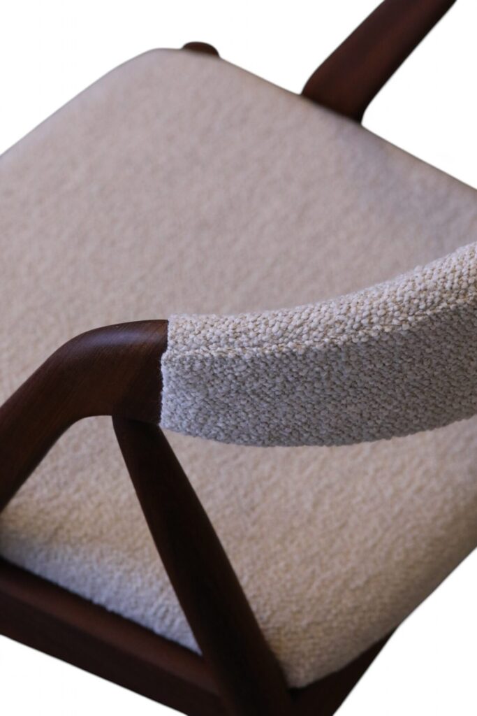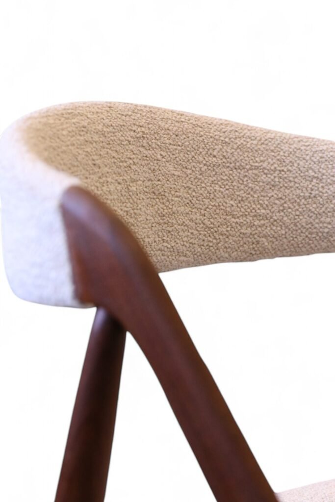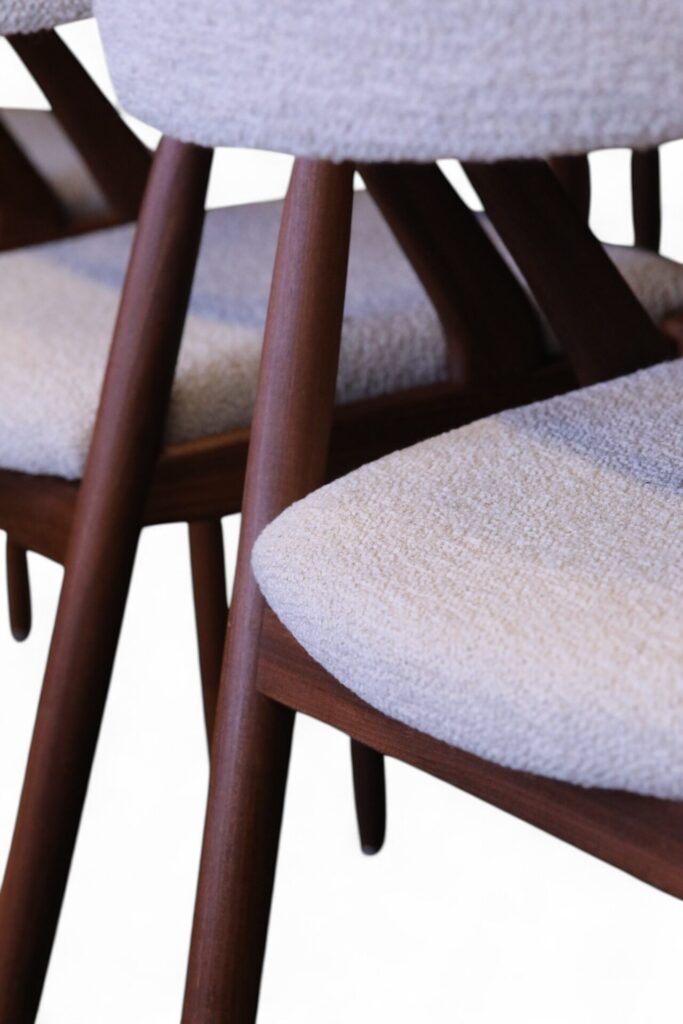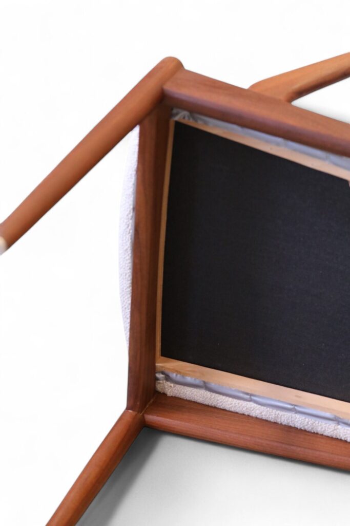 Den här uppsättningen är med både ben och karmar i teak. Stolen har blivit omtapetserad med en elegant klädsel i en skön beige boucle, som tillhör tyget Barnum i färg Linen från den svenska leverantören Nevotex. Boucle-strukturen ger en underbar och fin detaljrikedom, vilket inte bara tillför stolens design en modern touch, utan också förstärker och framhäver stolens karaktär på ett fint sätt. Det är en perfekt kombination av stil och funktionalitet!