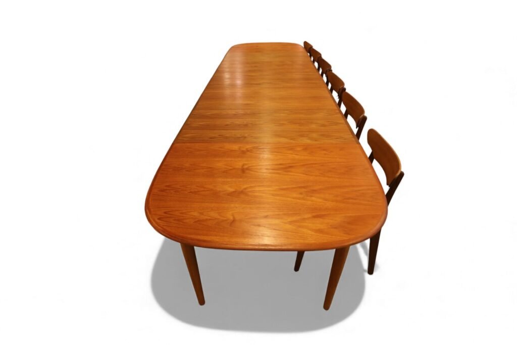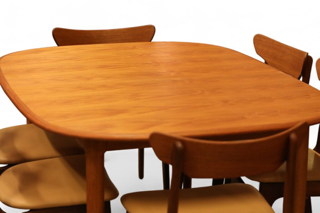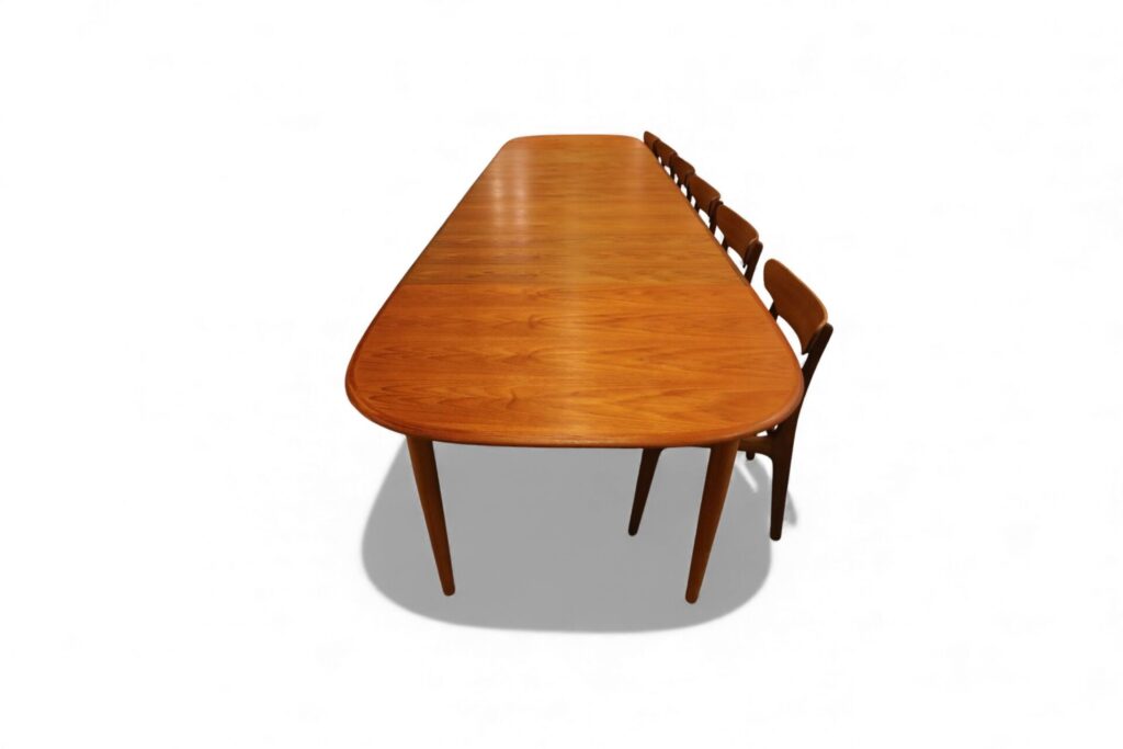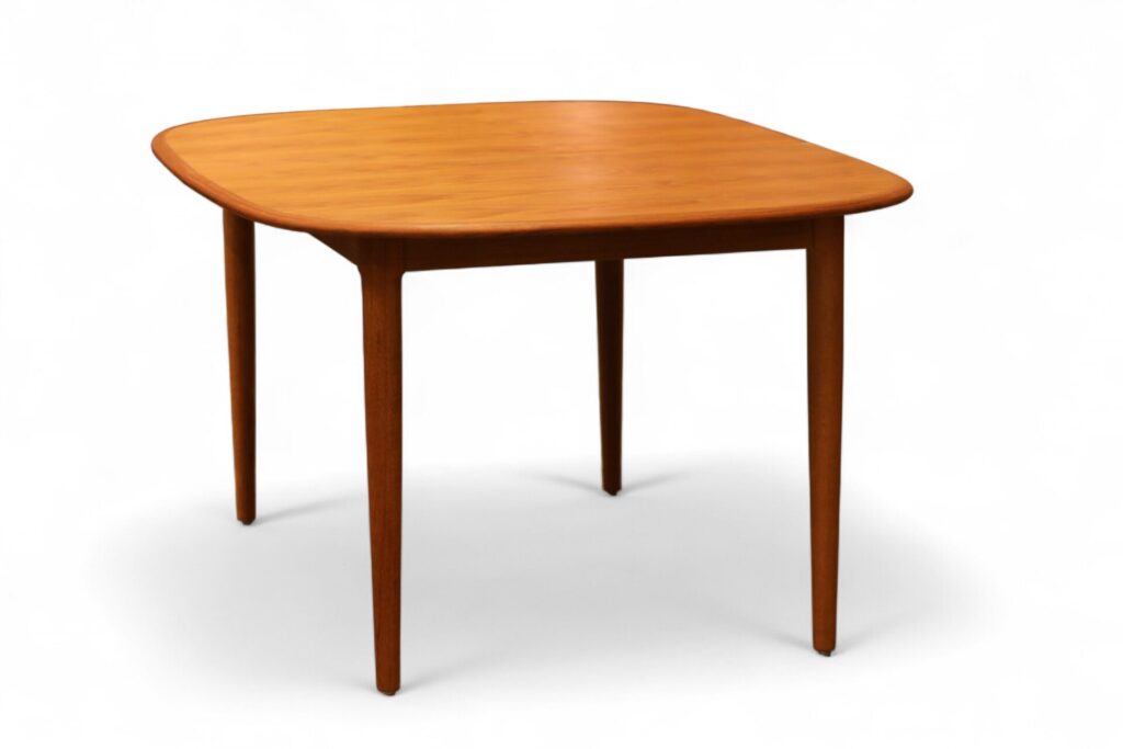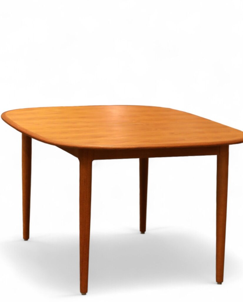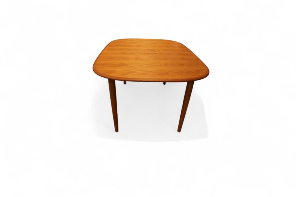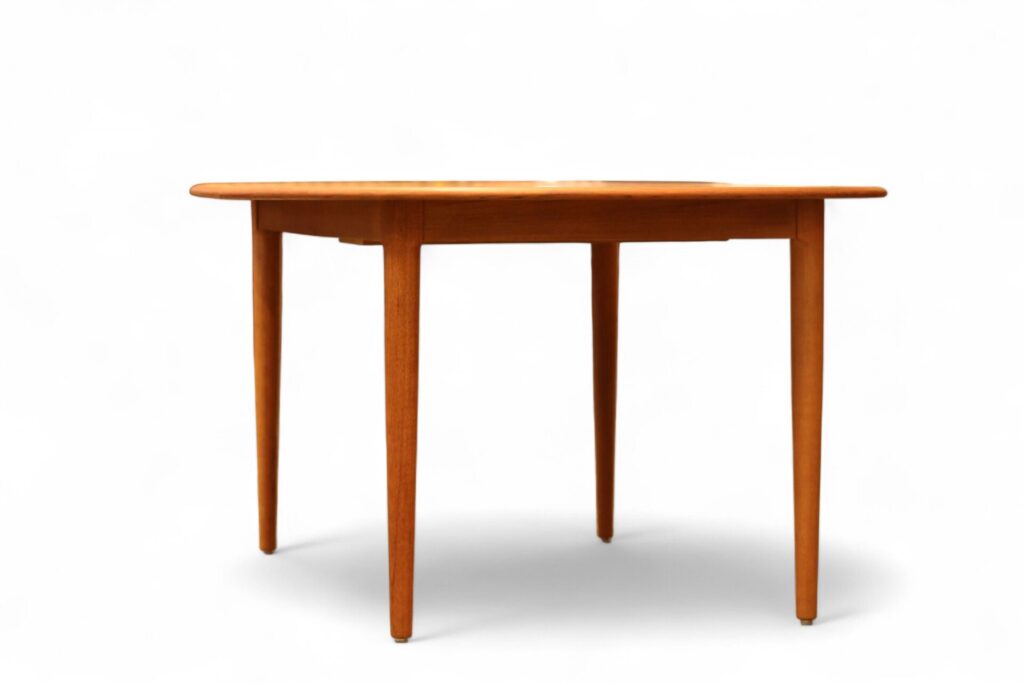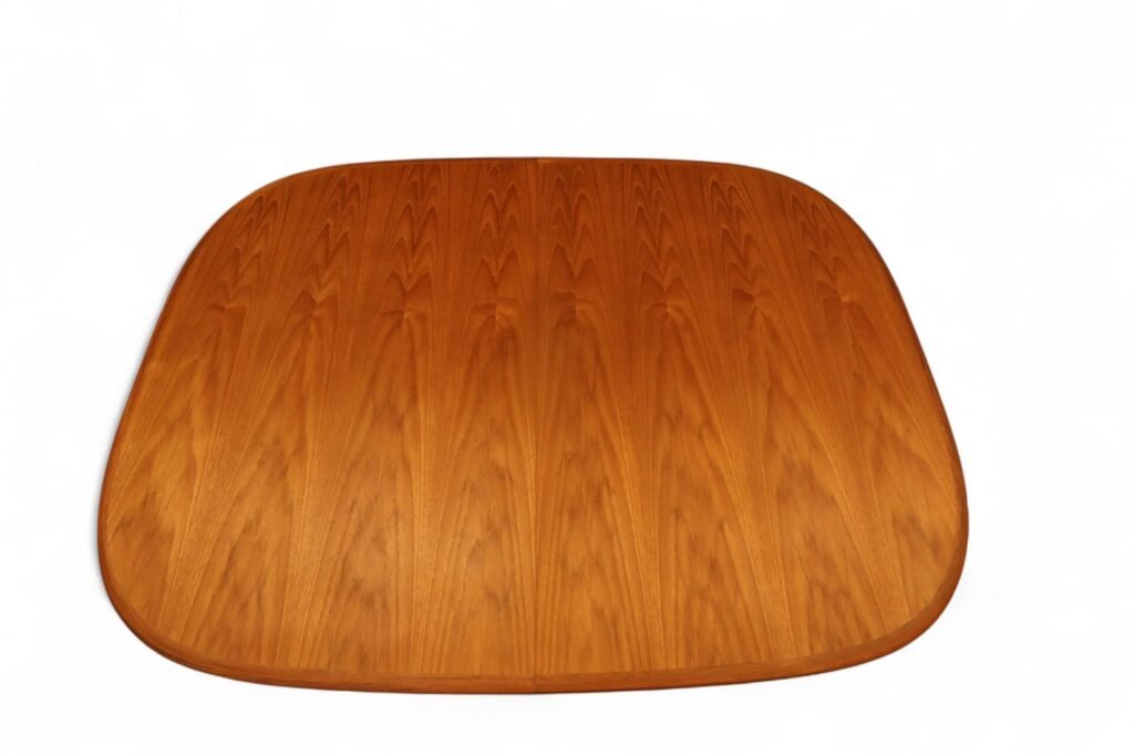 Matbordet är i teak samt tillverkat av Skovmand & Andersen i Danmark och utgångsläget på bordet är ovalt med mjukt formade hörn och kanter. Bordet står på runda avsmalnade ben som är enkla att demontera vid transport eller förvaring.