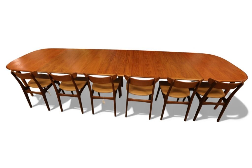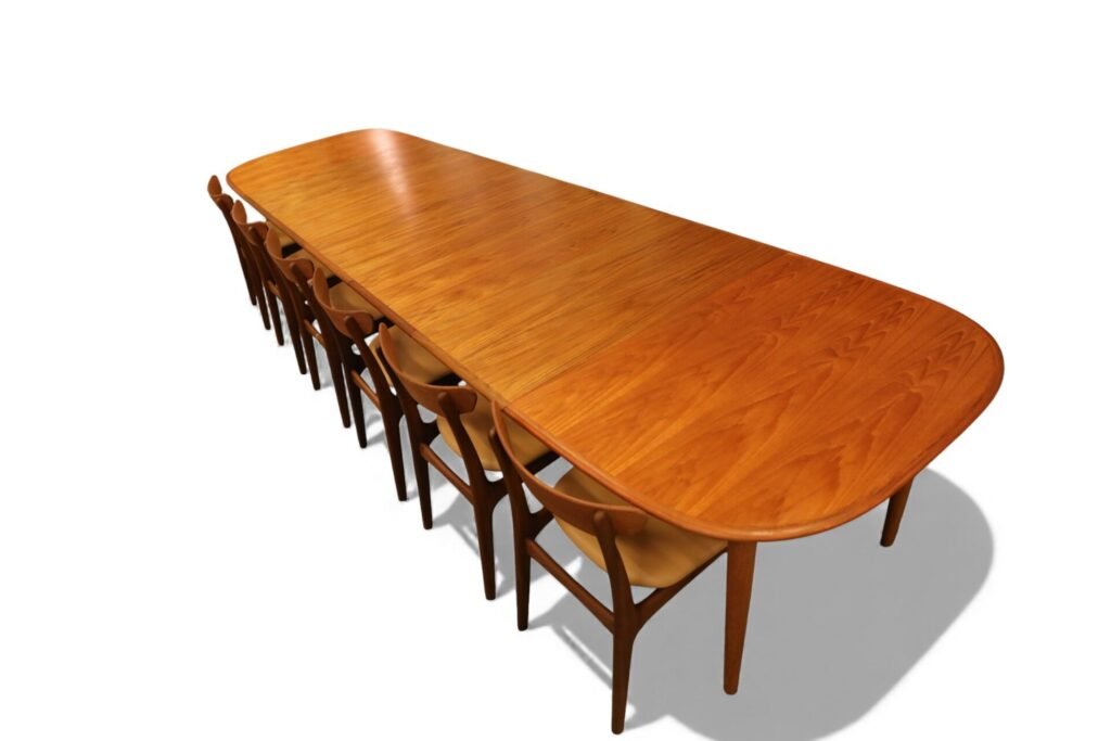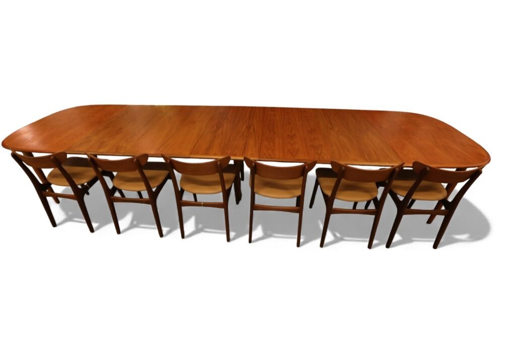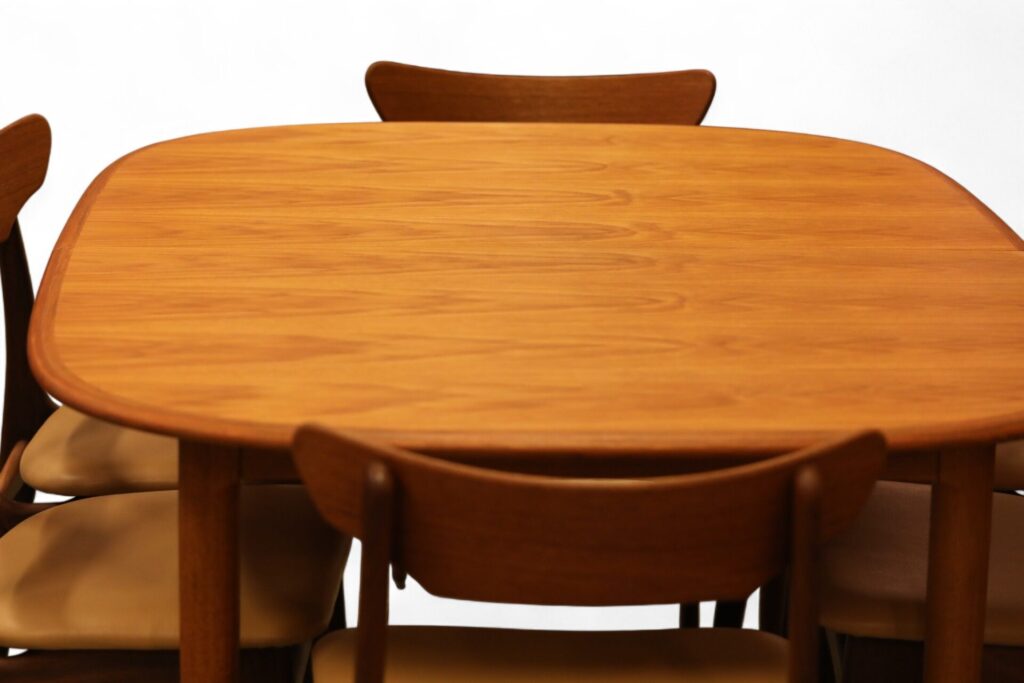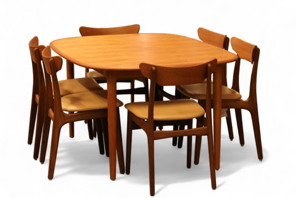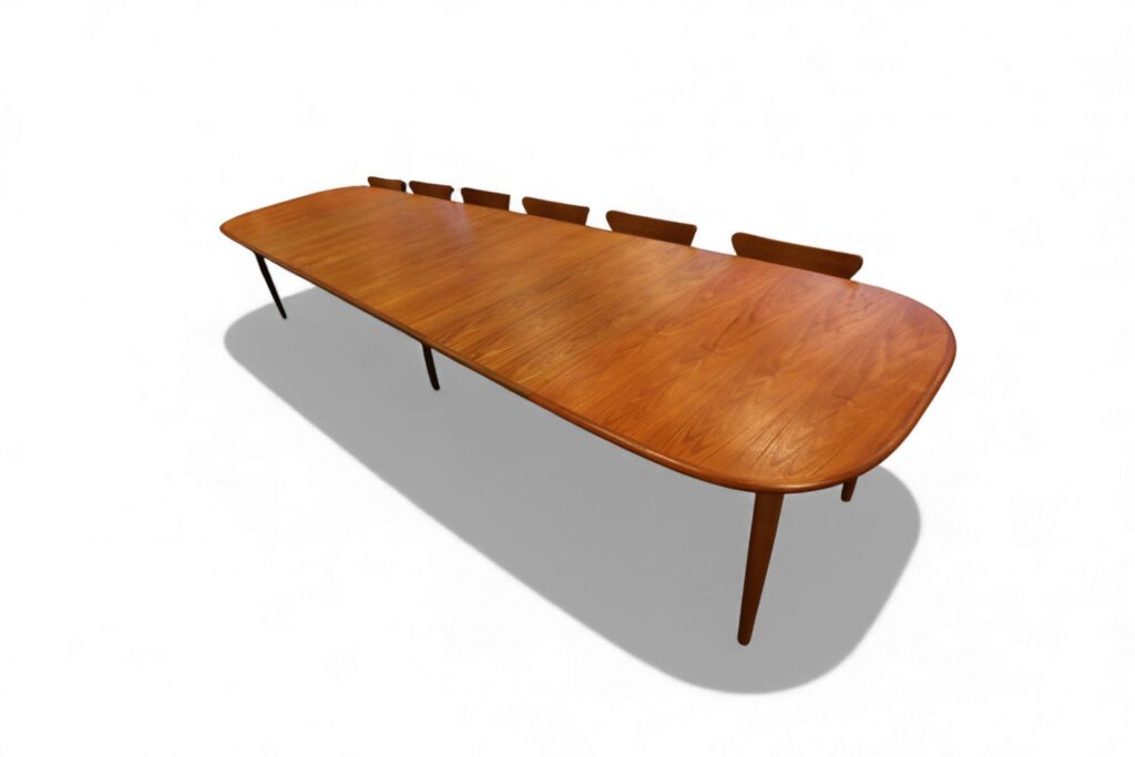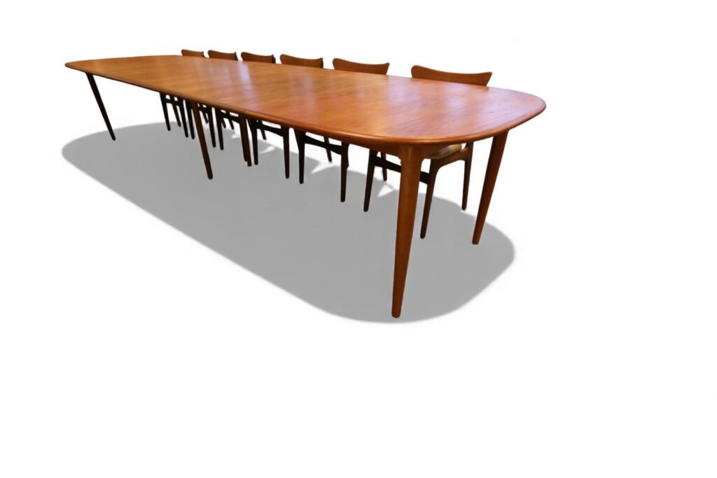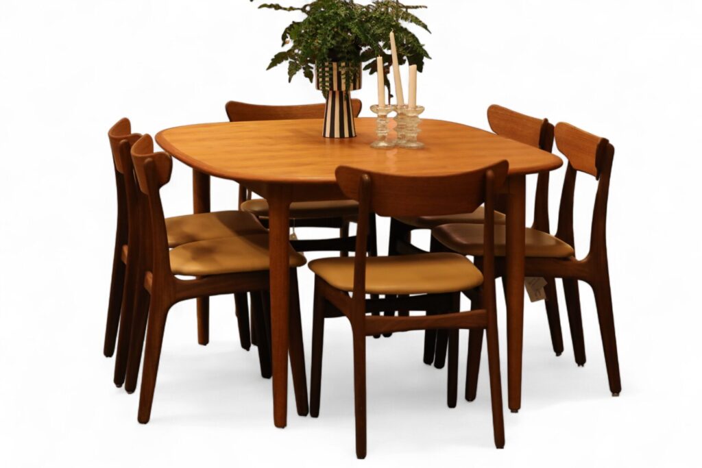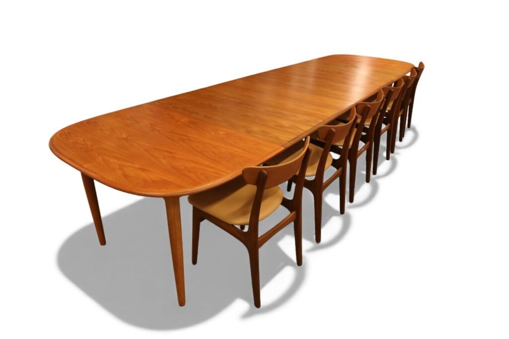 Matbordet är i teak samt tillverkat av Skovmand & Andersen i Danmark och utgångsläget på bordet är ovalt med mjukt formade hörn och kanter. Bordet står på runda avsmalnade ben som är enkla att demontera vid transport eller förvaring.