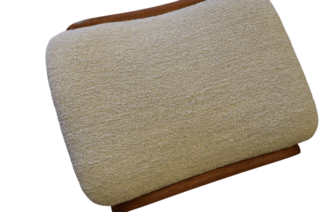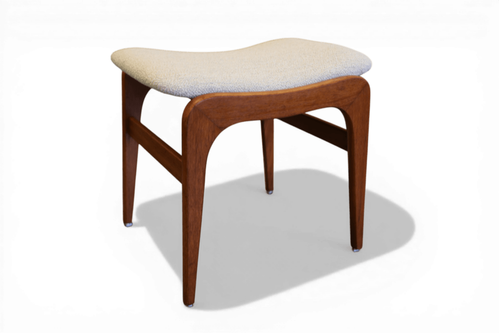 Sitsen är formad för att följa stommen på ett behagligt sätt och är klädd i ett ljust, strukturerat tyg som skapar en fin kontrast mot den varma teakramen. Pallen fungerar lika bra som fotpall till en fåtölj som fristående sittplats – eller som en stilren detalj i hallen eller sovrummet.