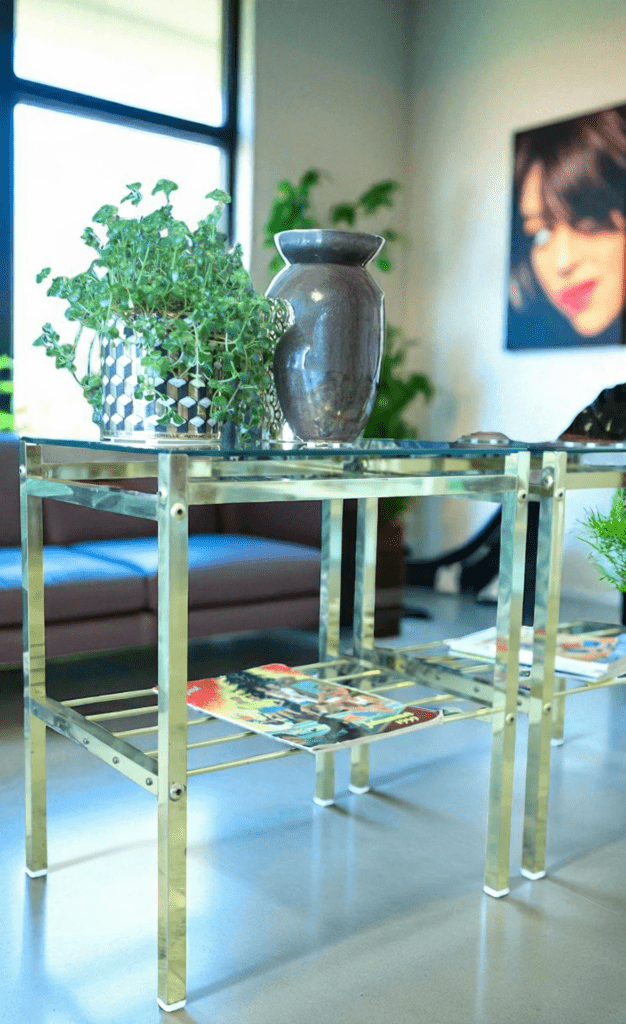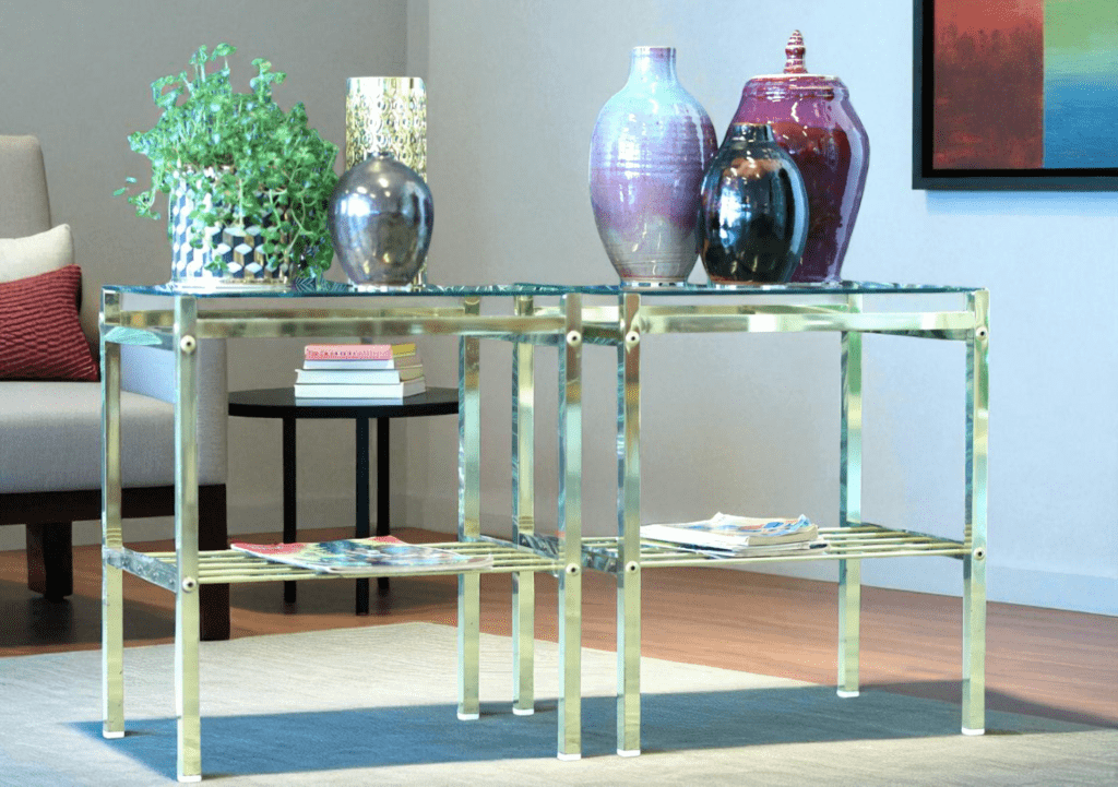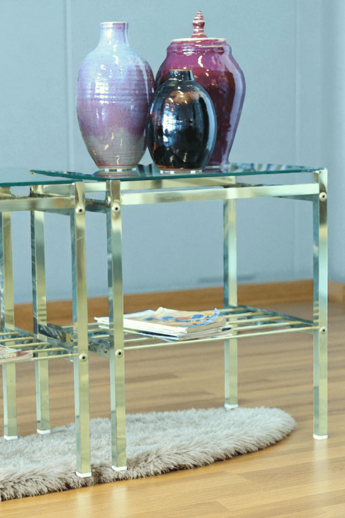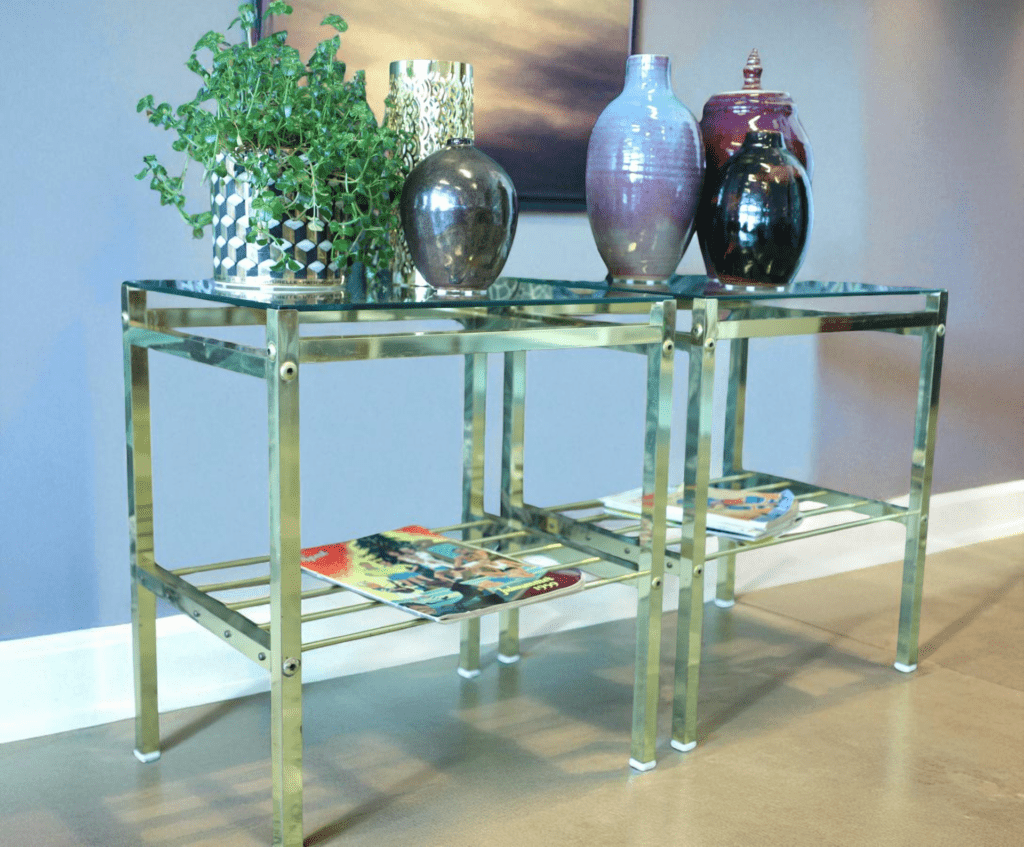 Paret bord i mässing och glas. Borden är mycket användbara i till exempel vid soffan som sidobord eller nattduksbord.