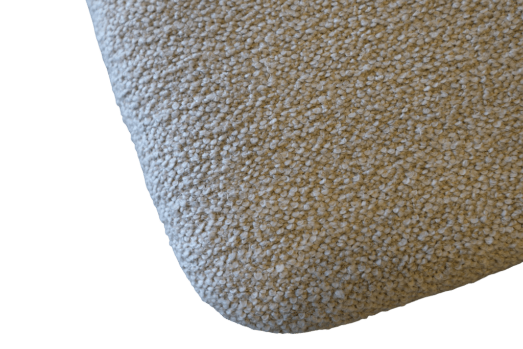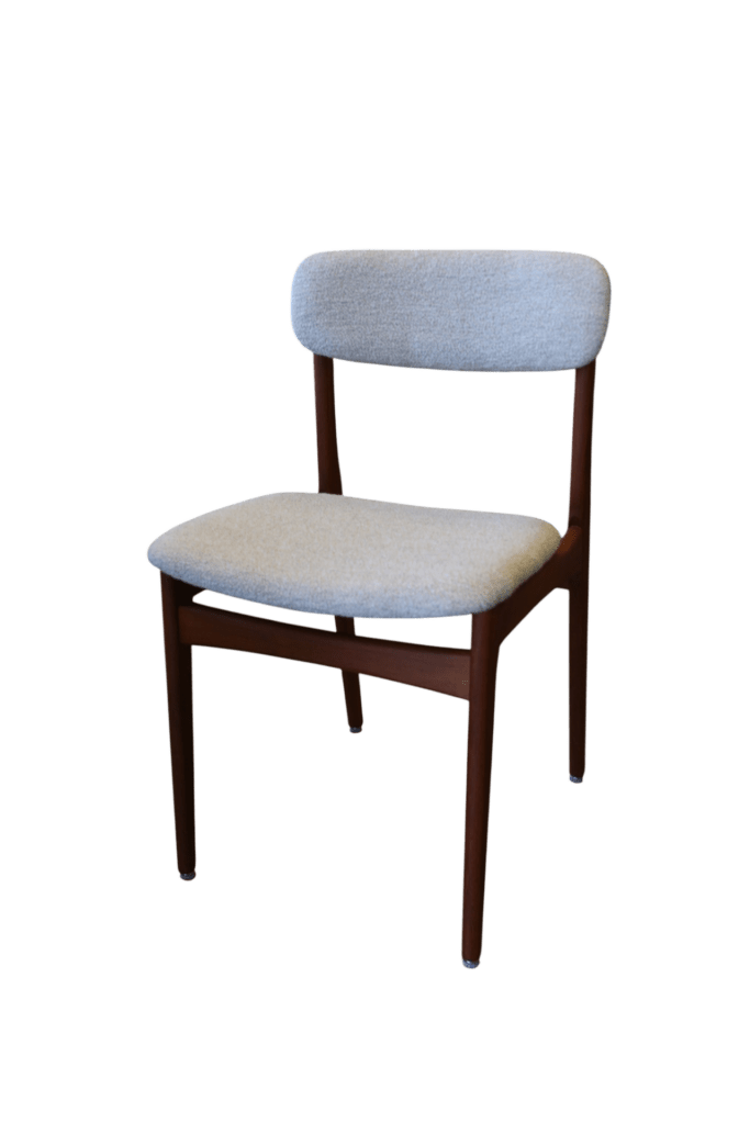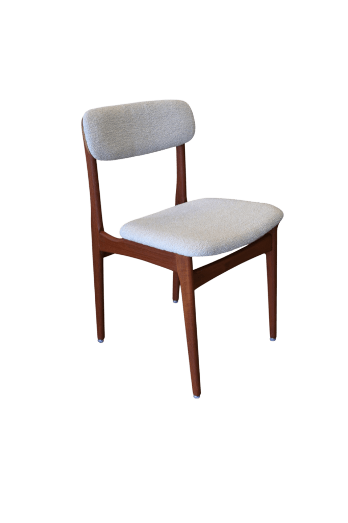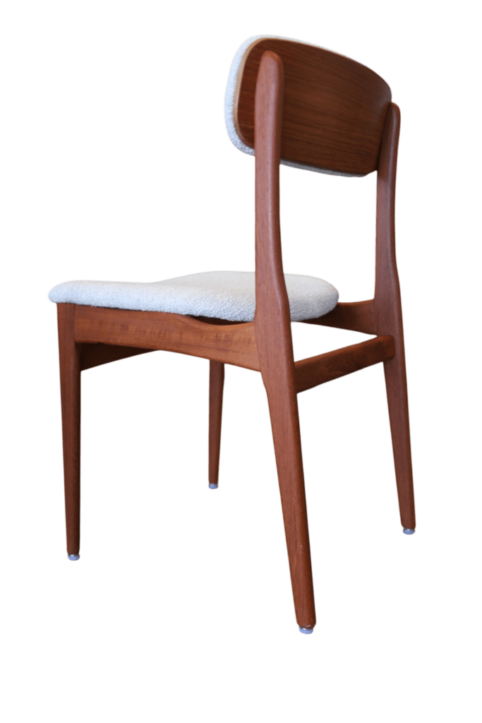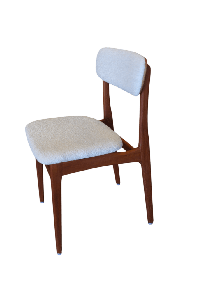 Stolens sits är mjukt skålad samt har ny modern stoppning i kallskum samt klädseln är i bouclé (Barnum Linen).