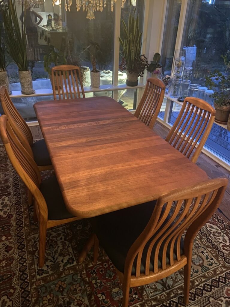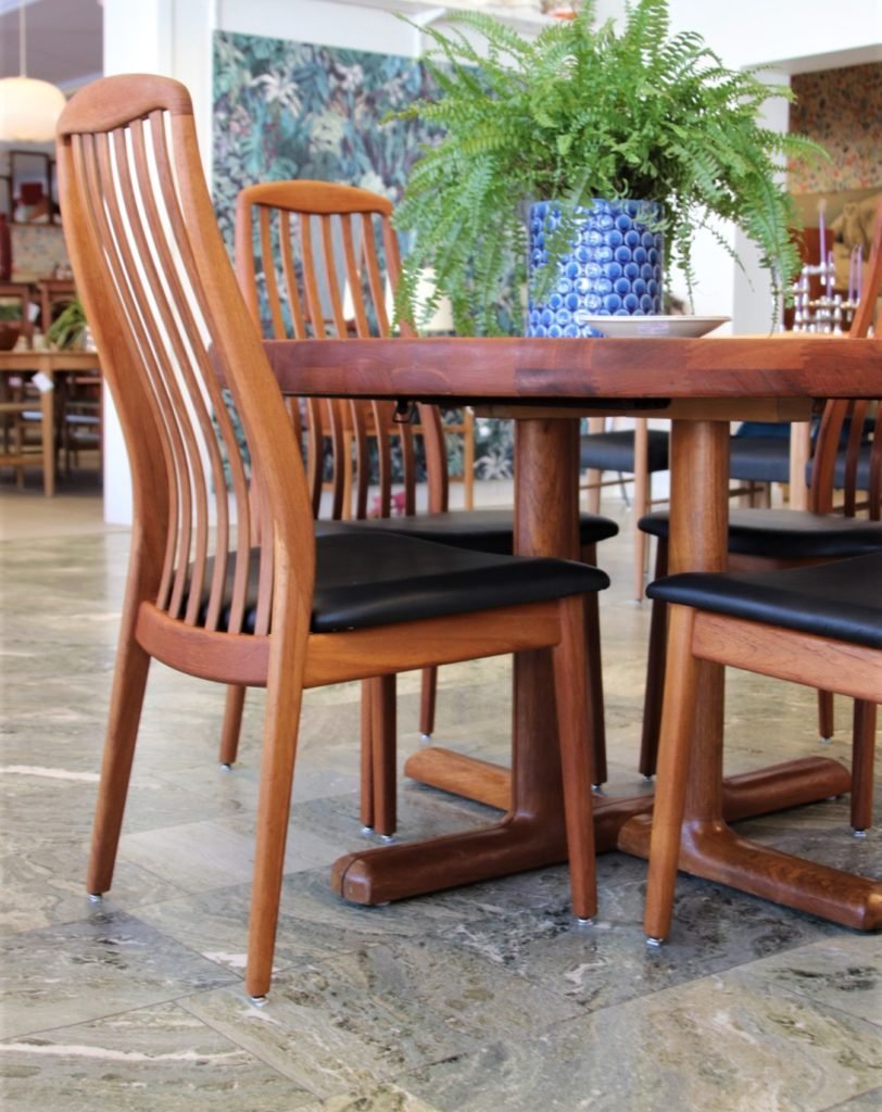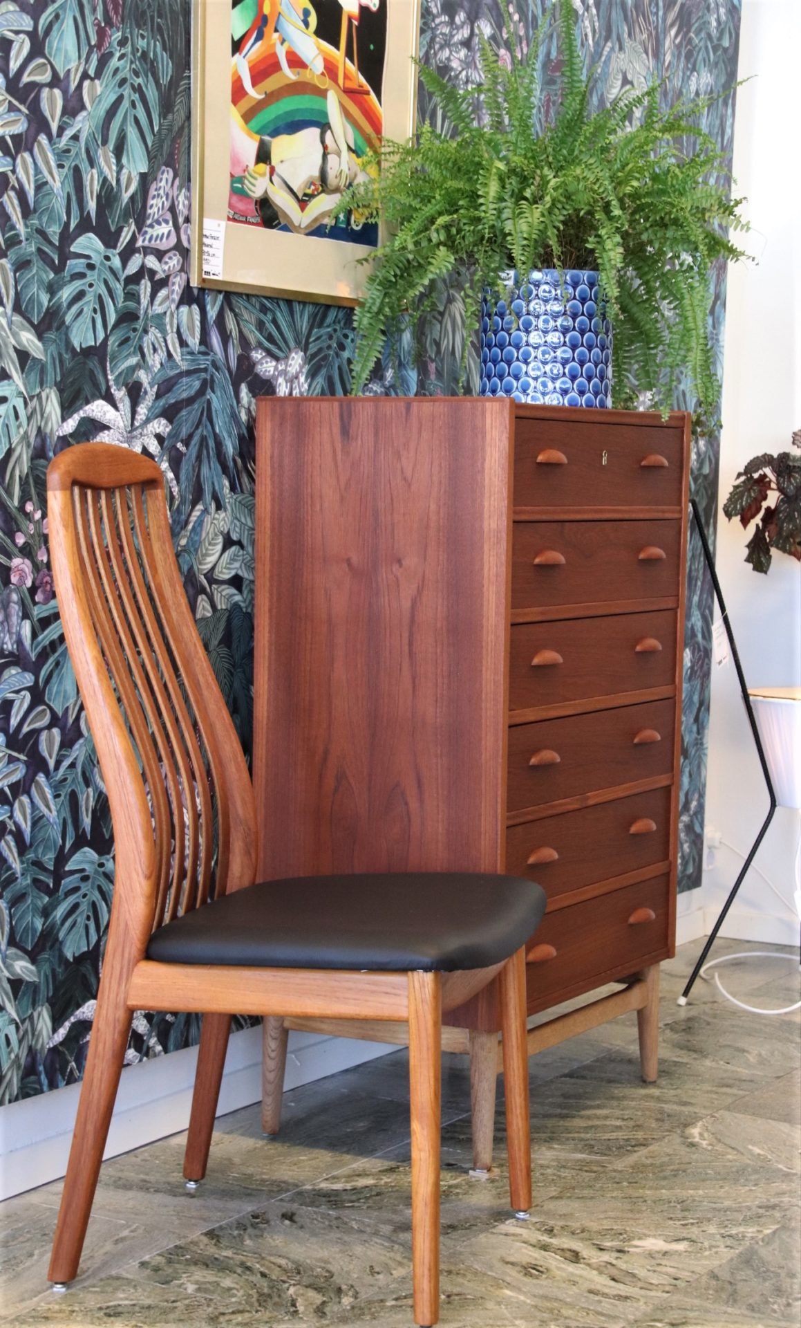 Formgivare är Schou Andersen i Danmark och stolen är tillverkad i massiv teak med en gyllene ton samt sits klädd i svart mjukt skinn.