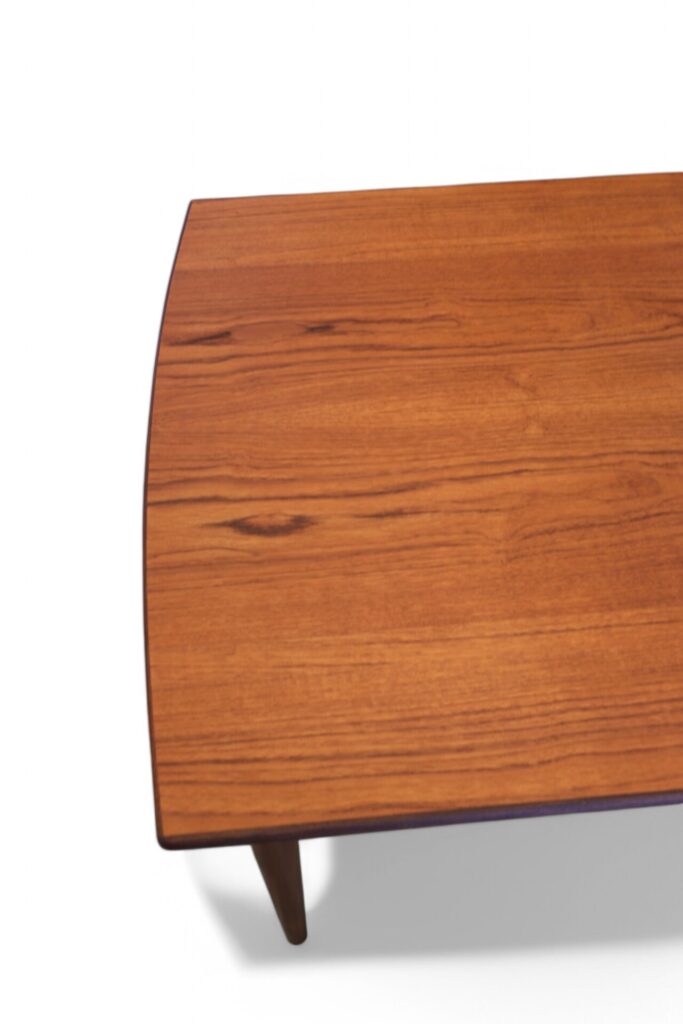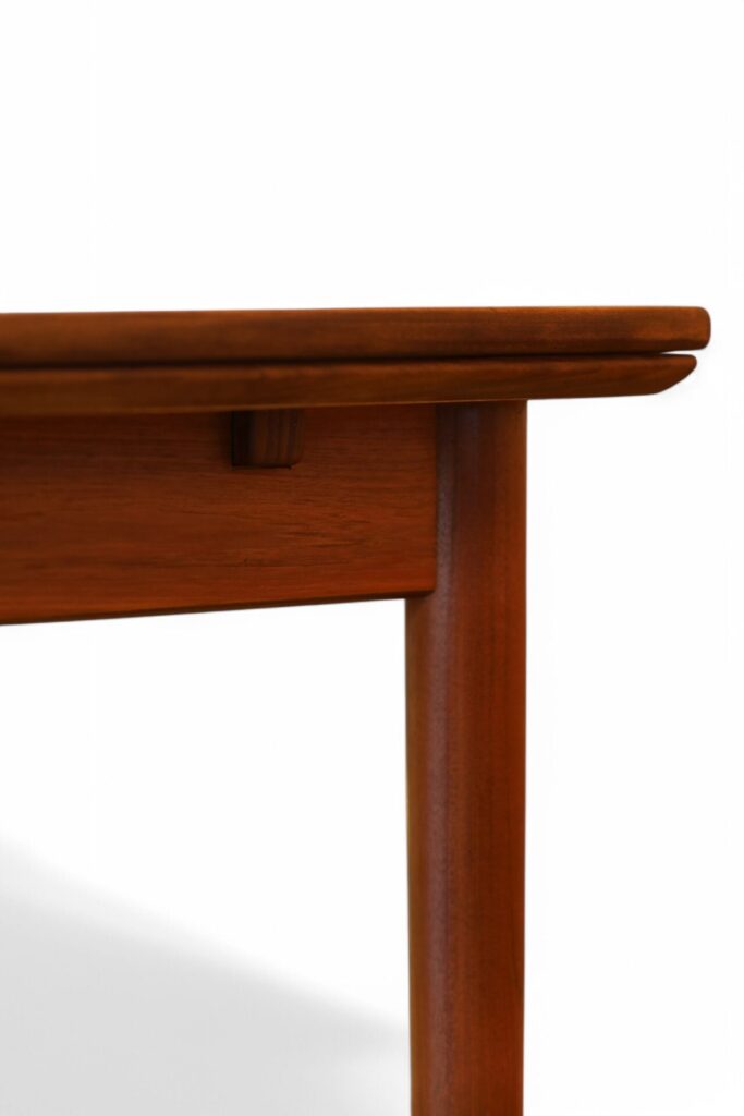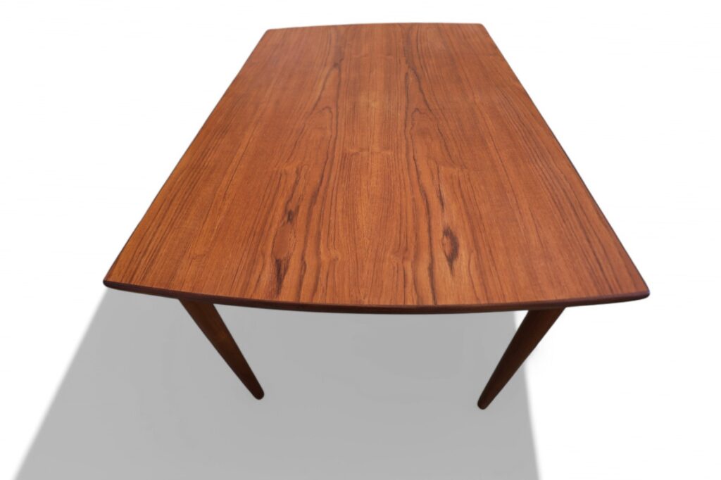 Bordet är i teak med en härligt mustig brun ton. Dessutom är benen och kanterna på bordsskivan i en mörkare ton och det ger fina kontraster mot varandra. Matbordet har en elegant och ytterst smal fris runt bordsskivan och kortsidorna är välvda och ger bordet ett nättare uttryck.