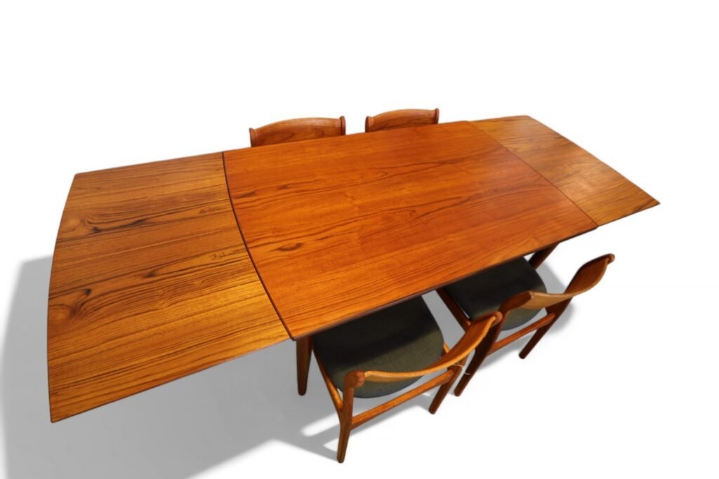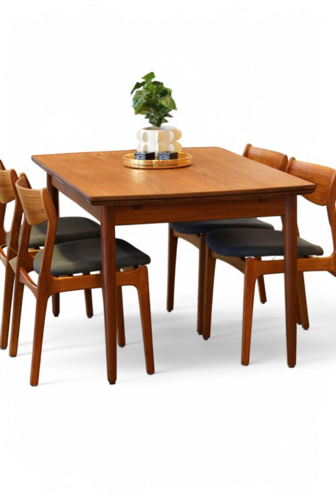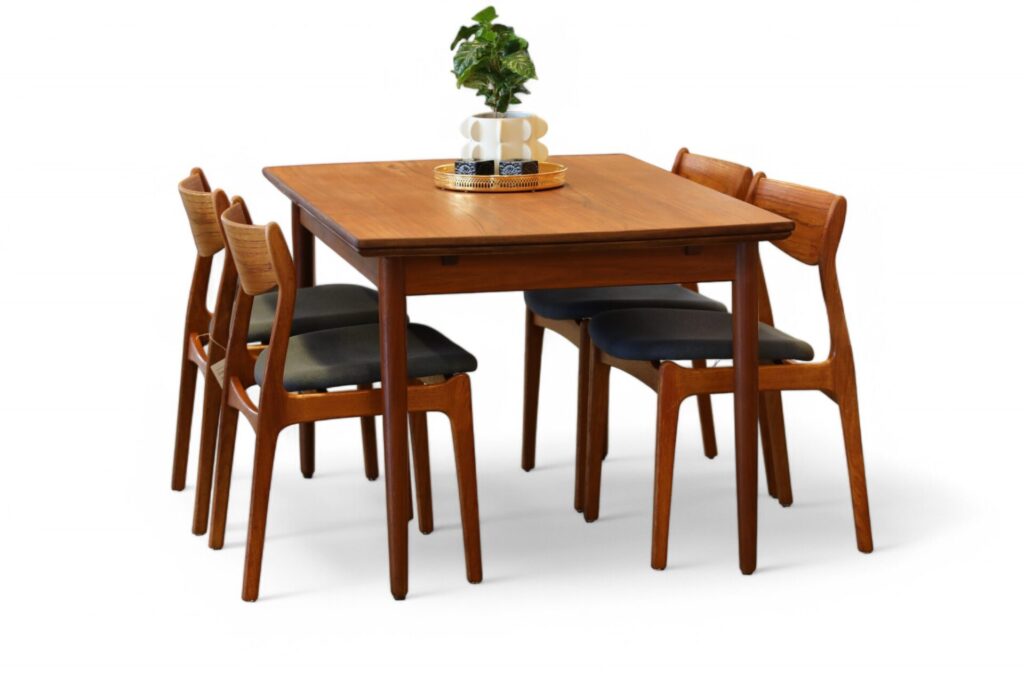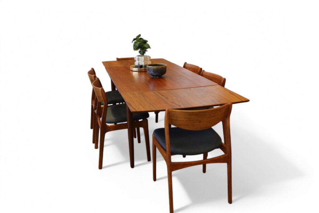 Danskt stilrent matbord med stora möjligheter att variera längd och sittmöjligheter runt om.