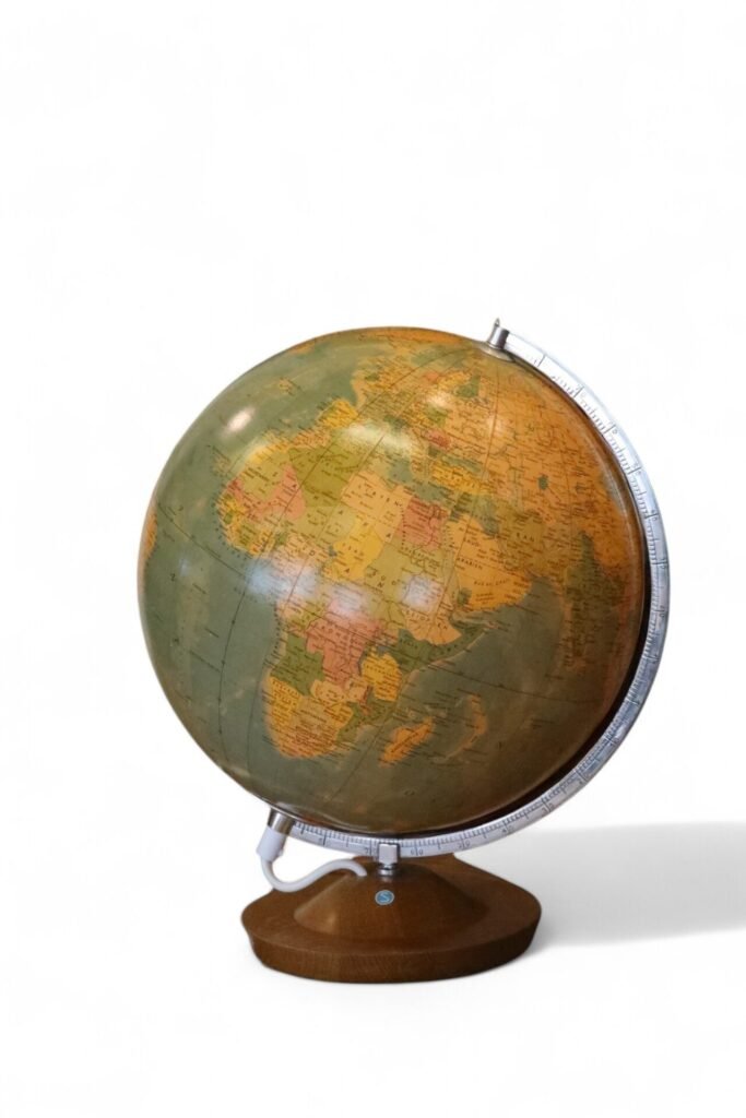 Märkt Räths politiska och globen är snurrbar samt står på en fot i trä. Strömbrytare på sladden gör det enkelt att tända och släcka belysningen.