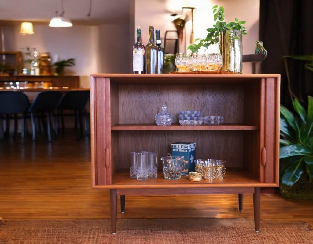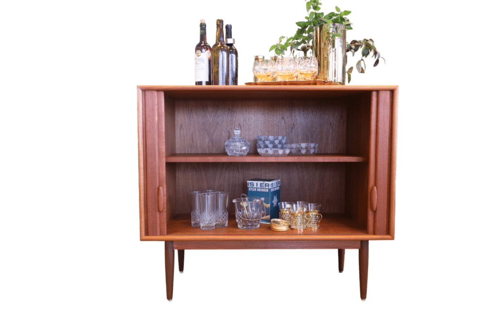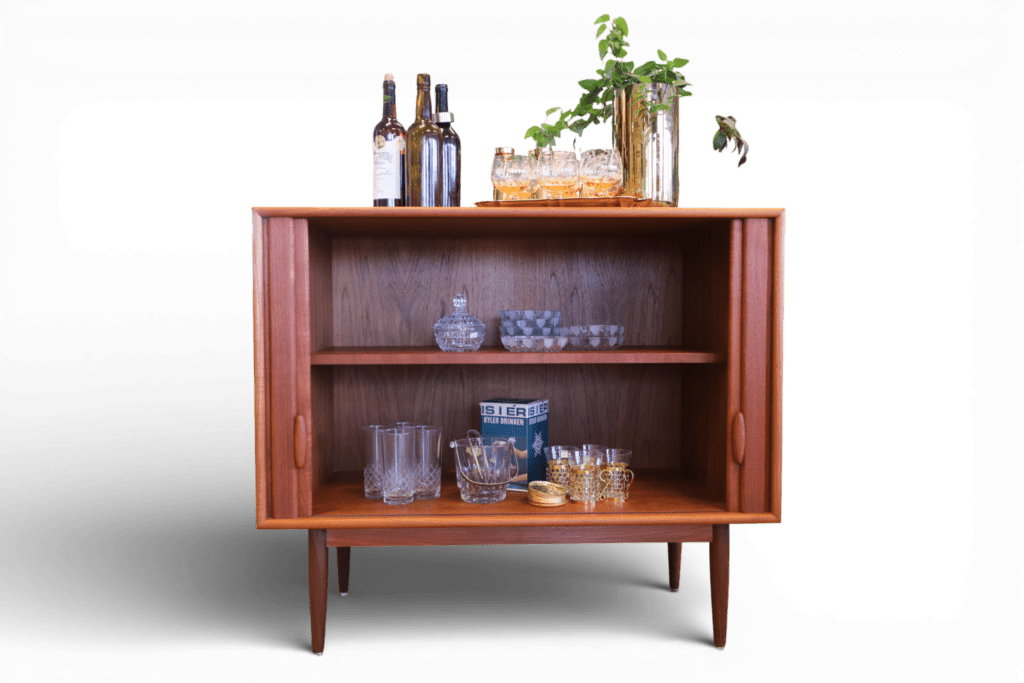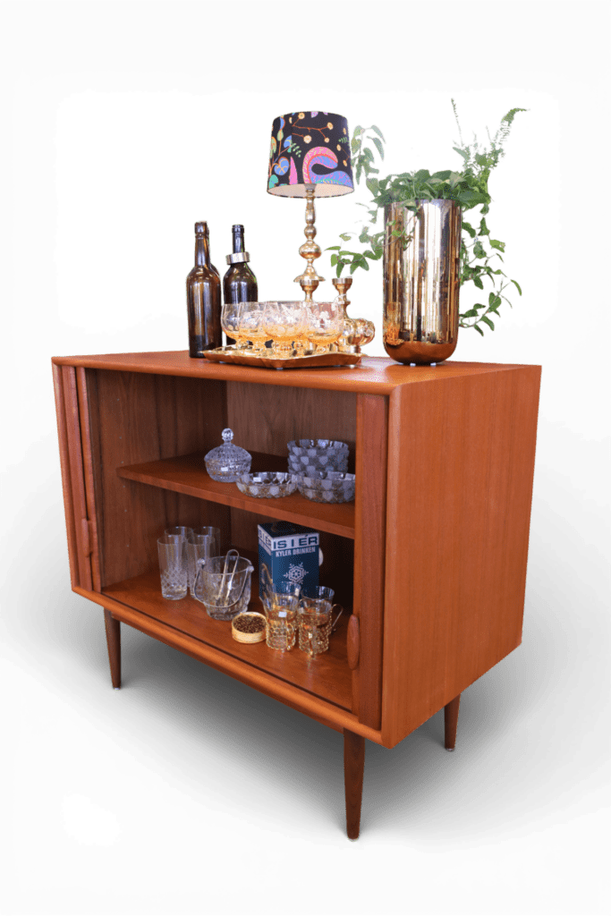Invändigt finns flytt- och uttagbart hyllplan i teak, vilket gör det lätt att anpassa förvaringen efter behov. Det gör skåpet till ett mycket flexibelt och användbart möbelval för dig som vill kombinera estetik med funktion.