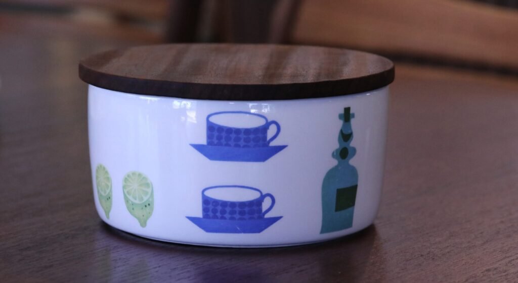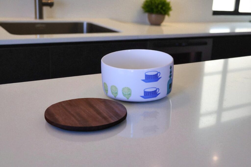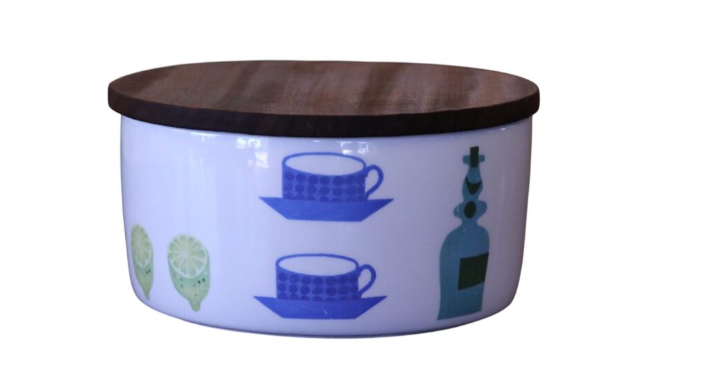 Karotten har vit botten med dekorativa, roliga mönster i klara och fina färger. Till karotten medföljer ett lock i teak.
