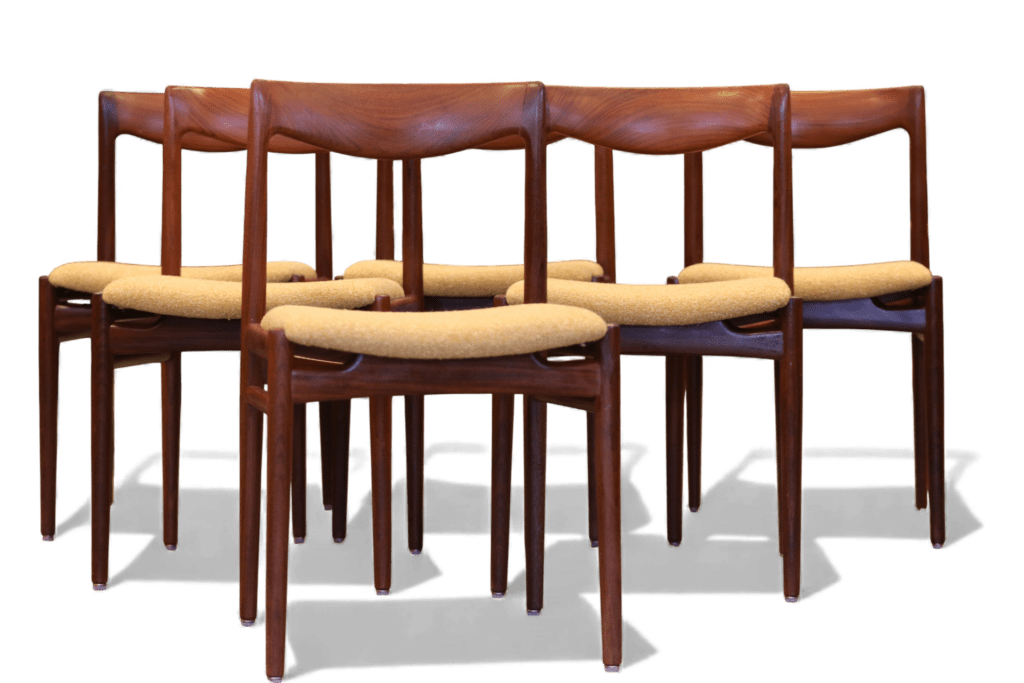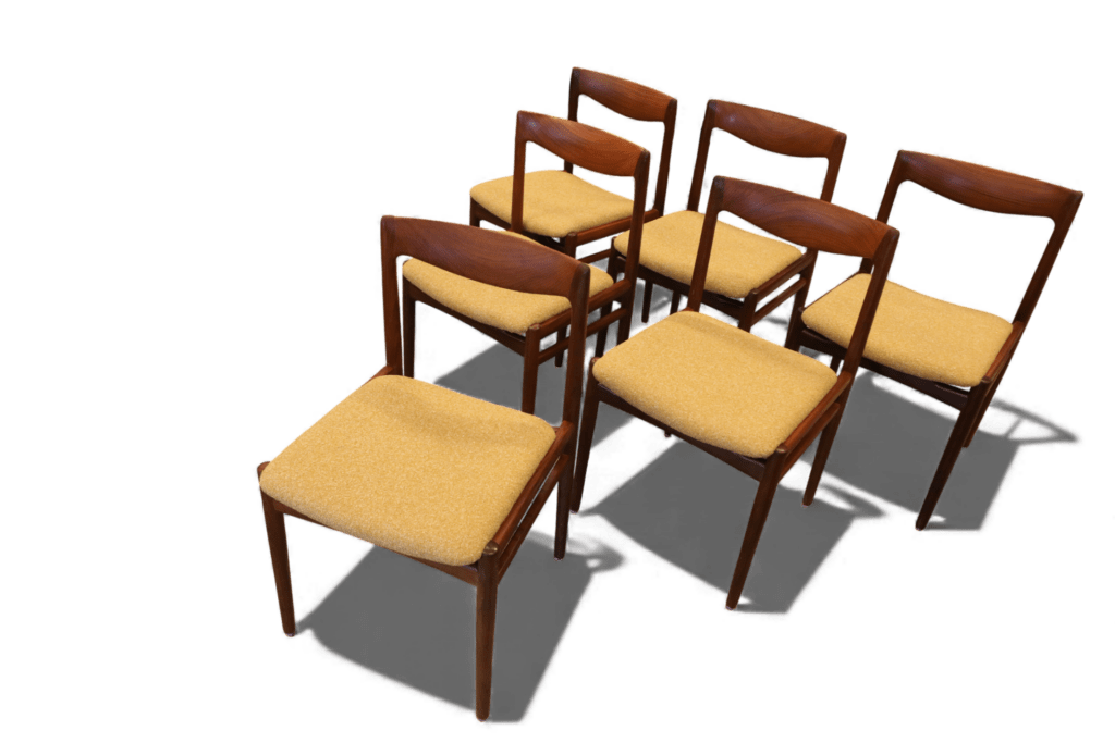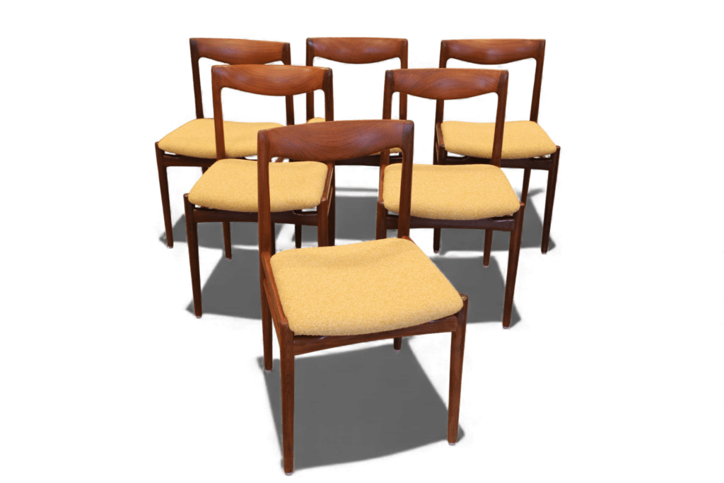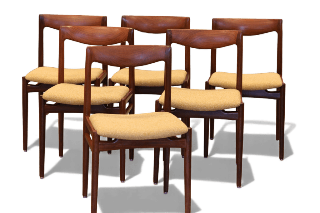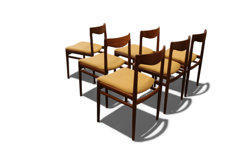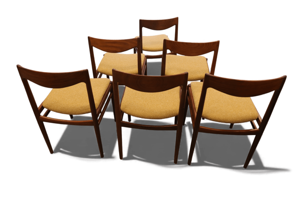 Ett set om sex stolar i valnöt i en mörk och mustig ton. Stolarna är formgivna av Gustav Herkströter för företaget Lübke.