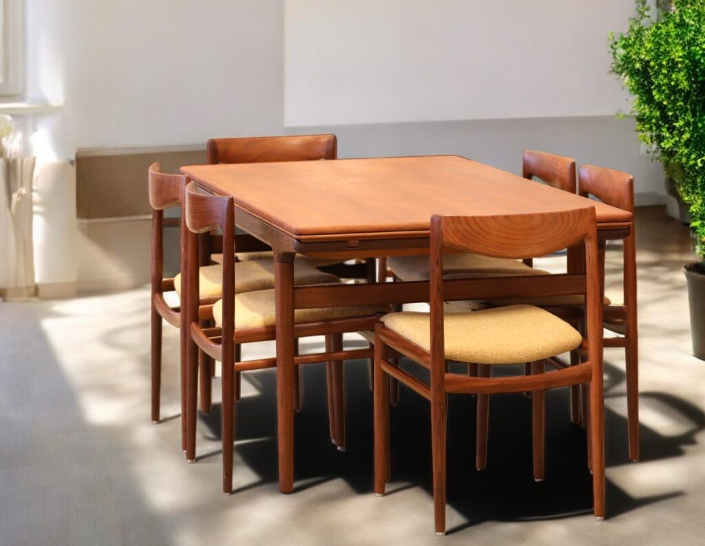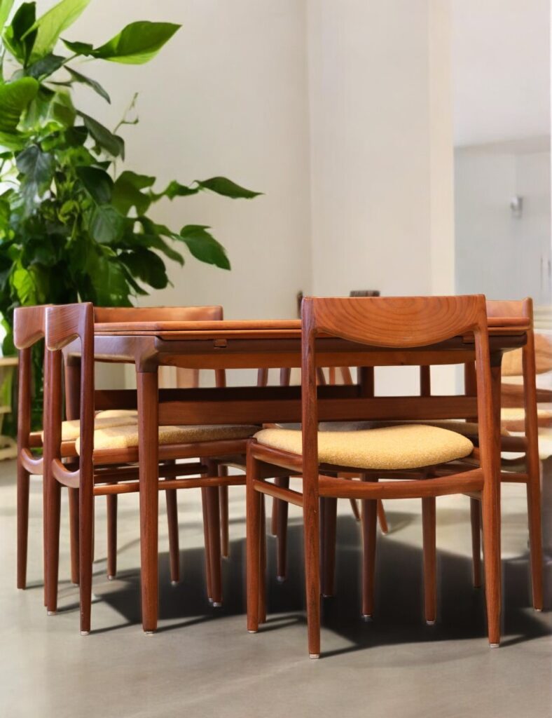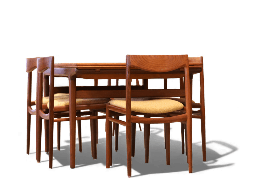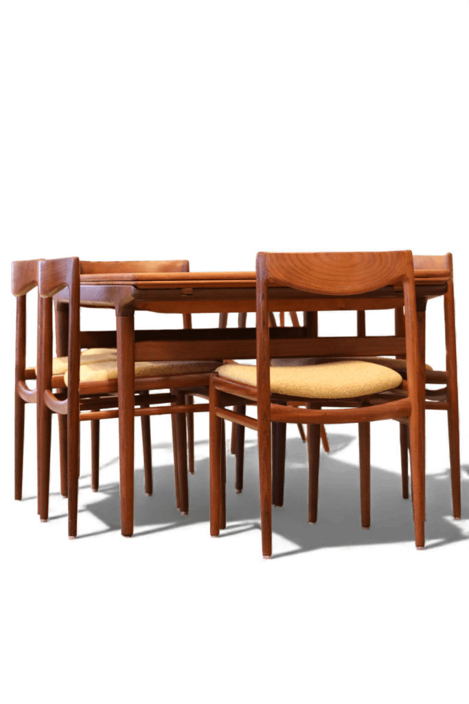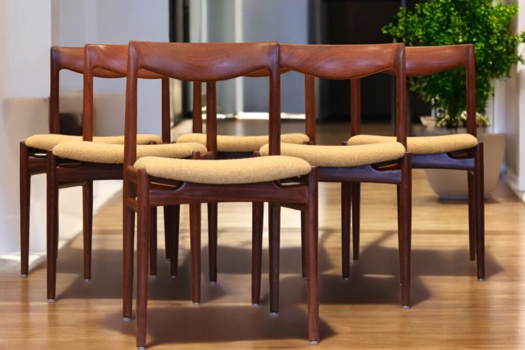 Ett set om sex stolar i valnöt i en mörk och mustig ton. Stolarna är formgivna av Gustav Herkströter för företaget Lübke.