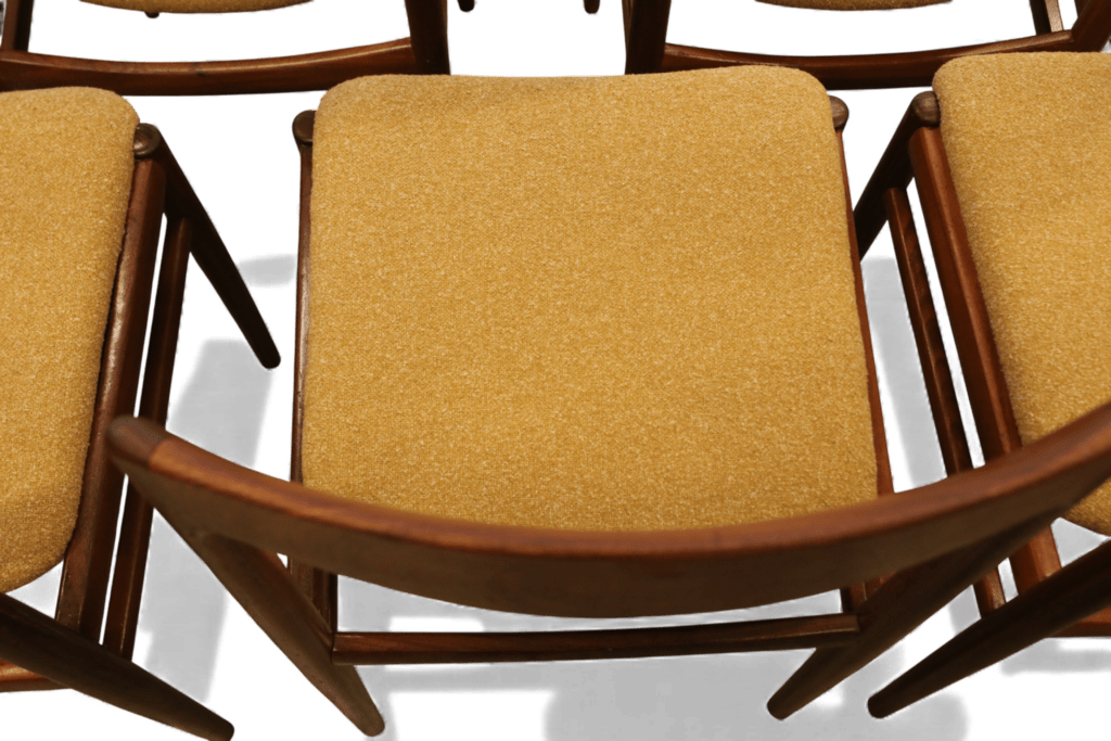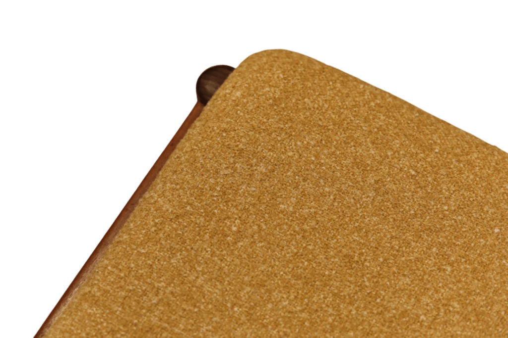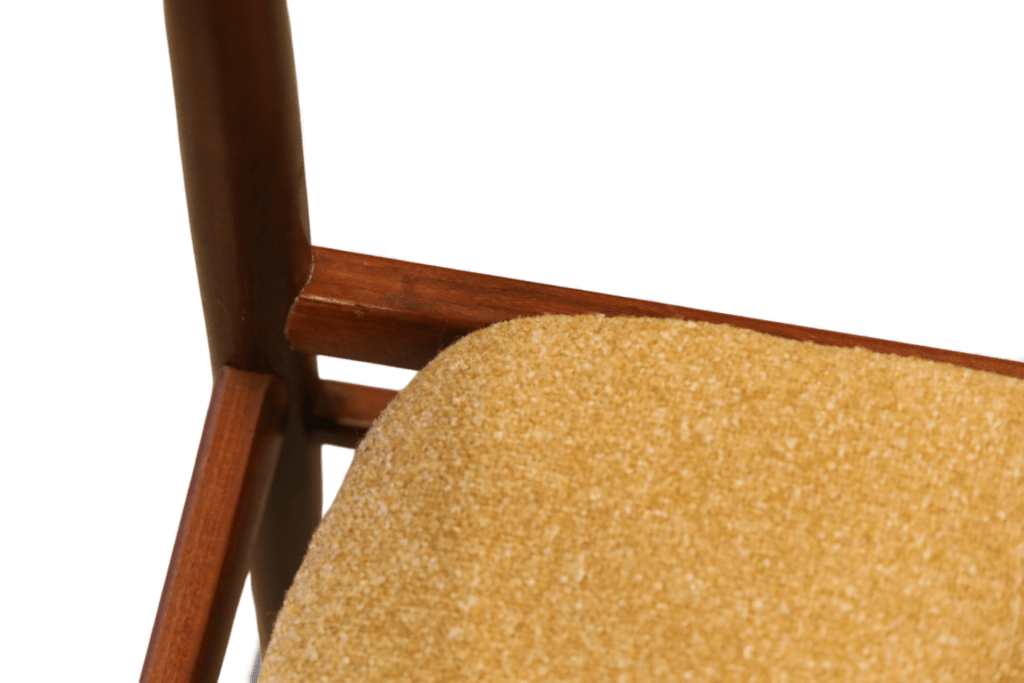 Sitsen ligger i stolsramen och är klädd i ett vackert senapsgul/mörkbeige boucletextil, som inte bara ger en fin kontrast mot stommens färg, utan även bidrar till en luxuös känsla och ökar stolens estetiska värde.