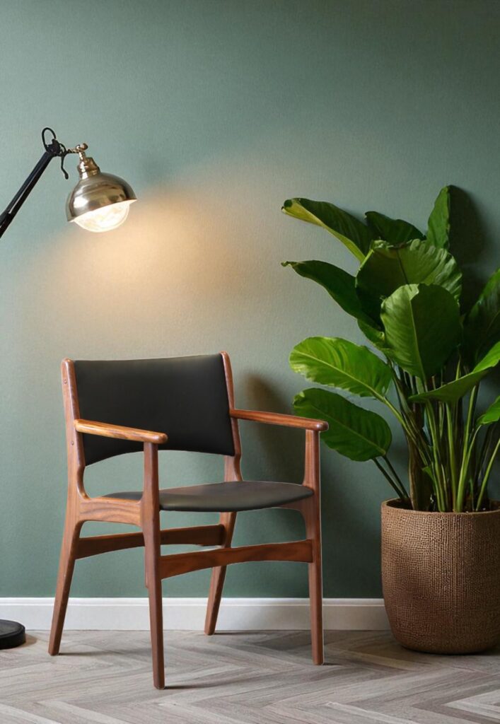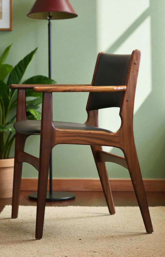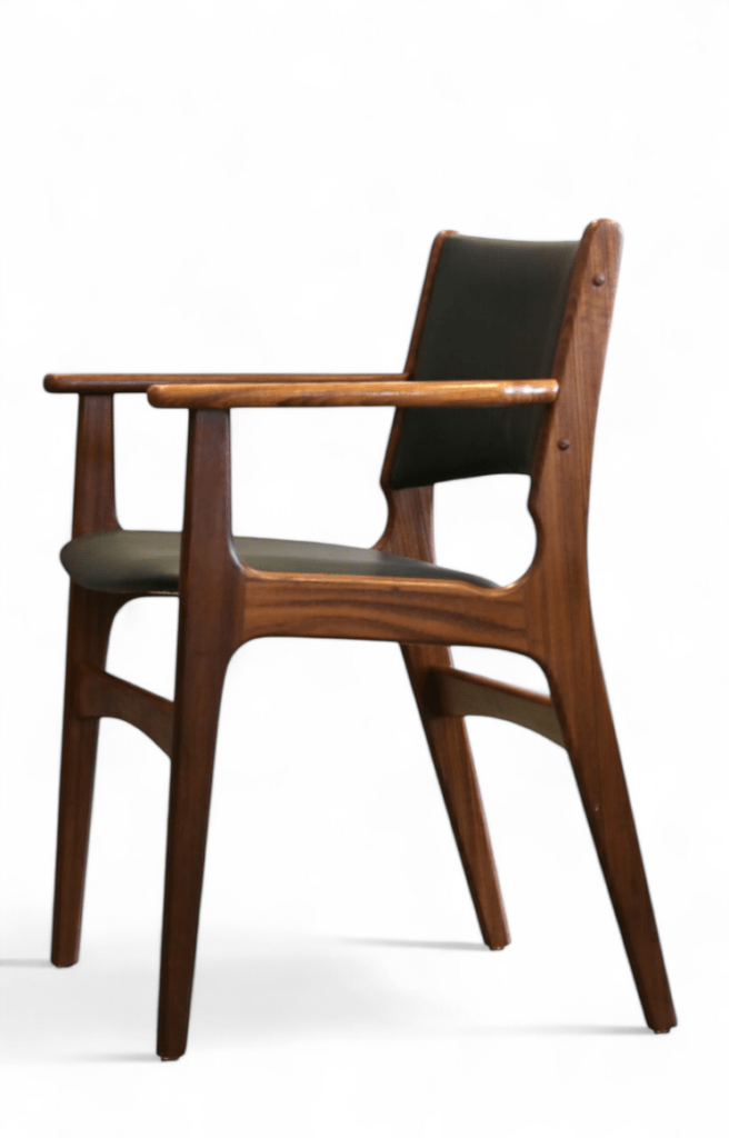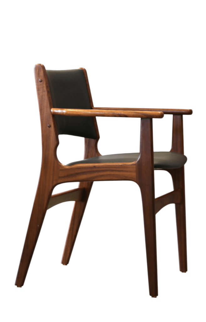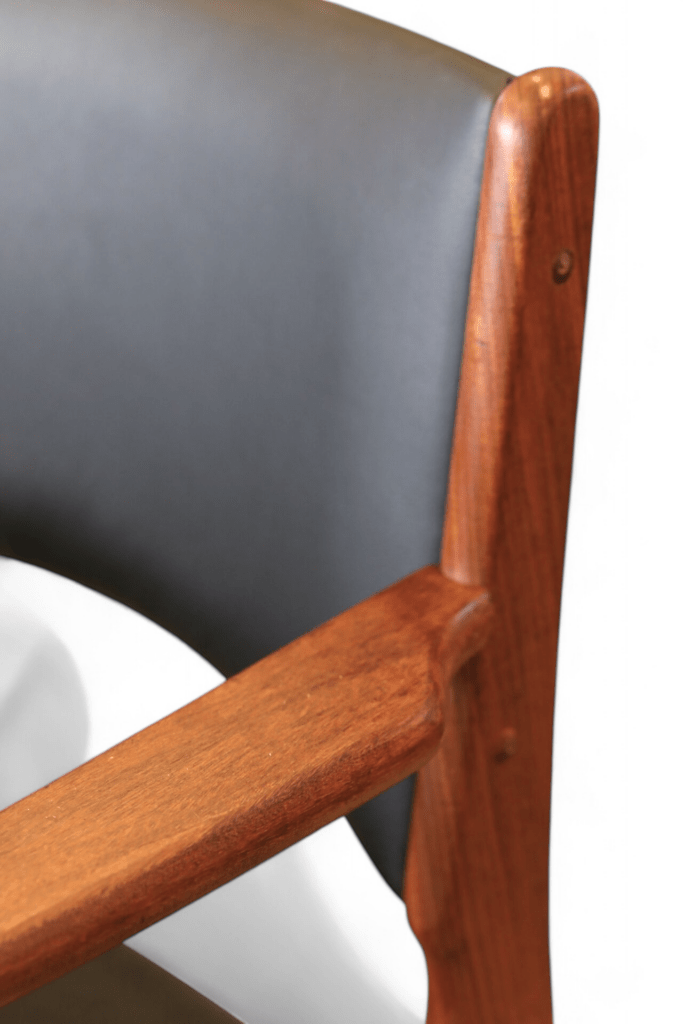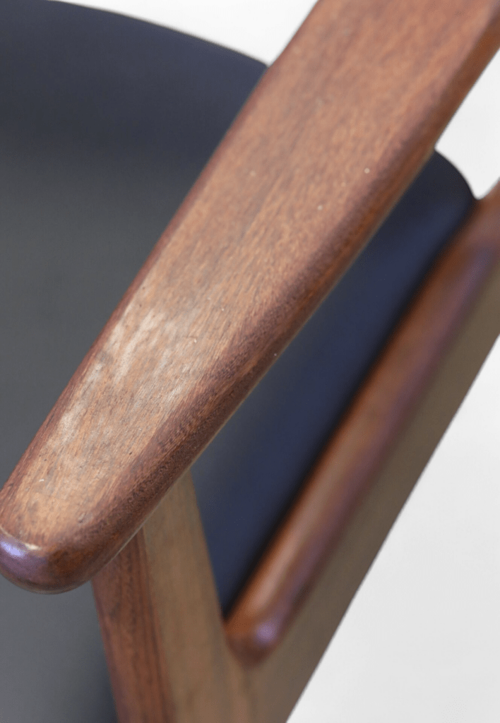 Sitsen och ryggen är klädd i svart mjukt skinn samt har ny stoppning. Vi har fler karmstolar i mod 89 som vi kan klä om sits och rygg i valfri textil eller annan färg på skinnet.
