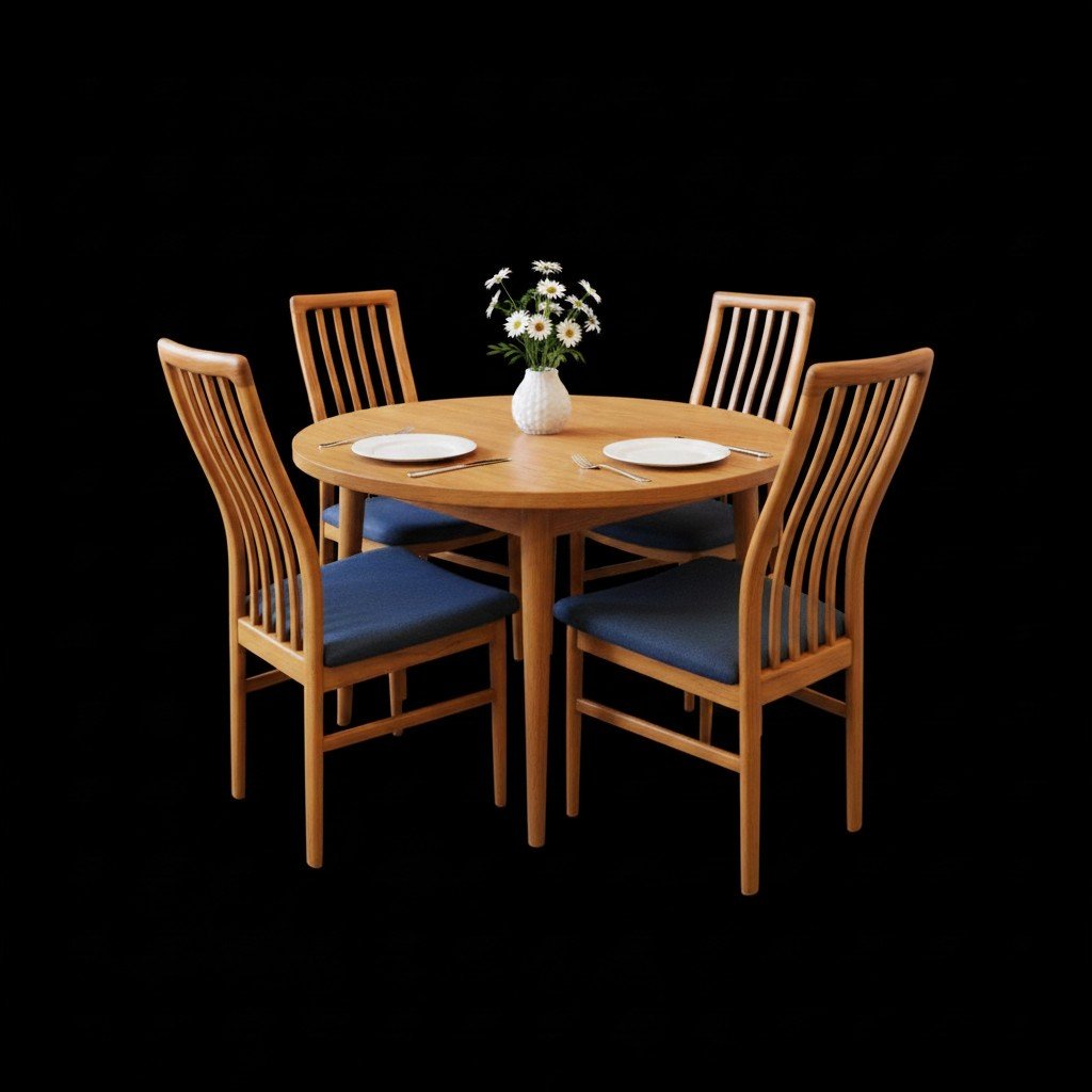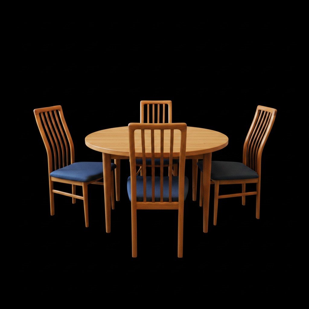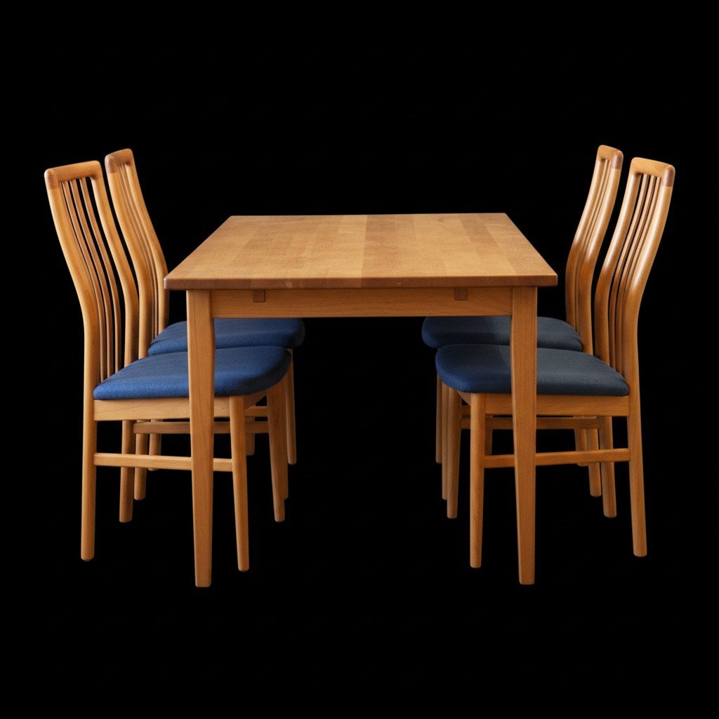 Formgivare är Schou Andersen i Danmark och stolen är tillverkad i massiv teak med sits klädd i en ett ulltyg i blå, Lillehammer nr 5 Pacific.