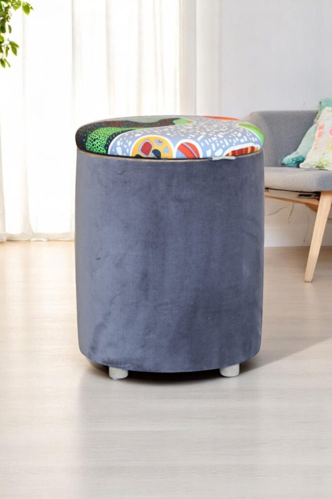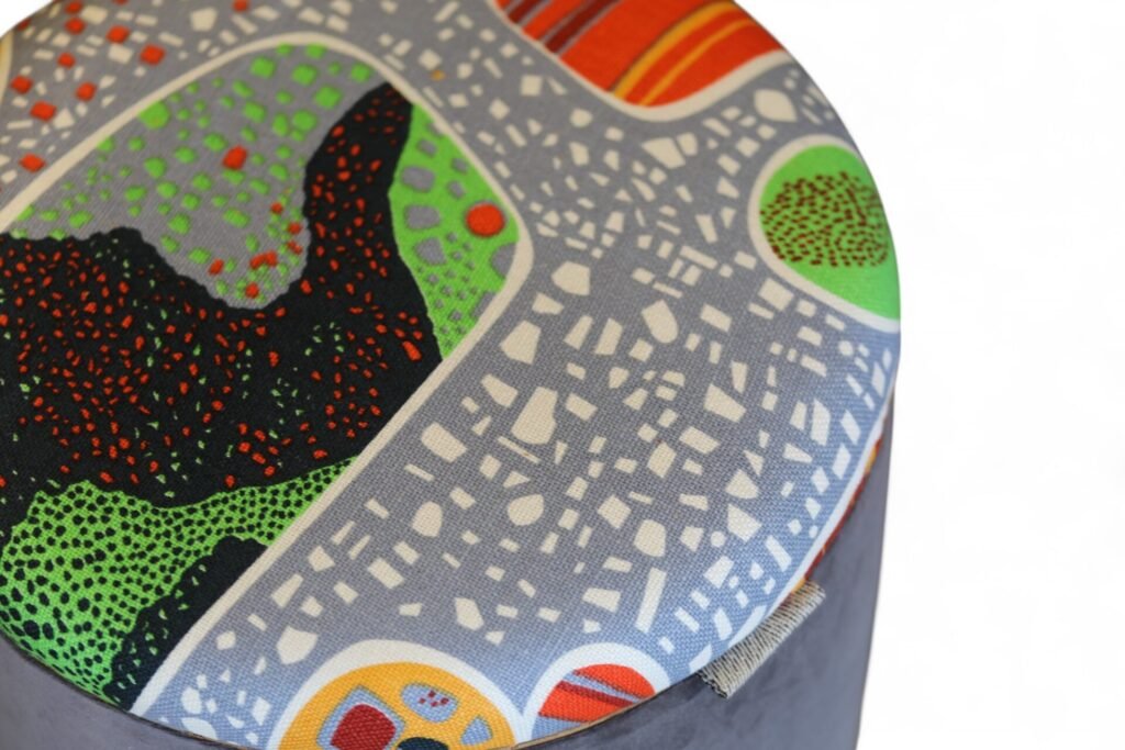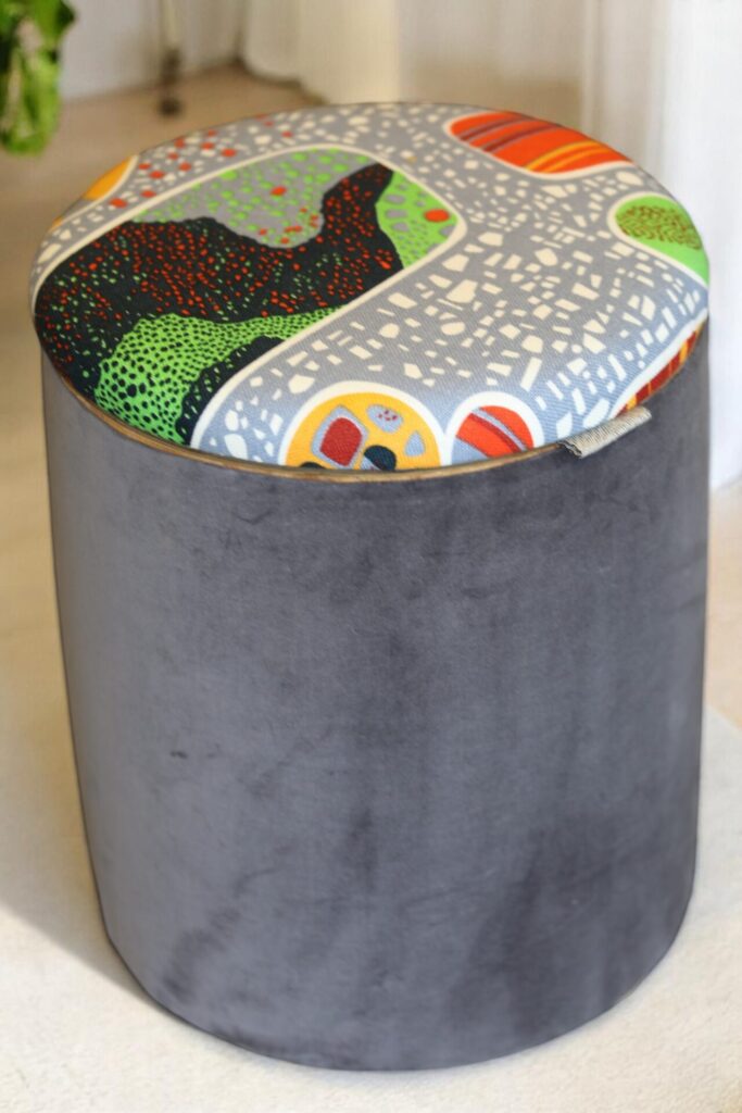 Pallen är klädd i linnetyget Terrazzo 450 formgivet av Josef Frank för firma Svenskt Tenn och mönster är inte i produktion just nu. Runt om pallen är den klädd i grått tyg i sammet.